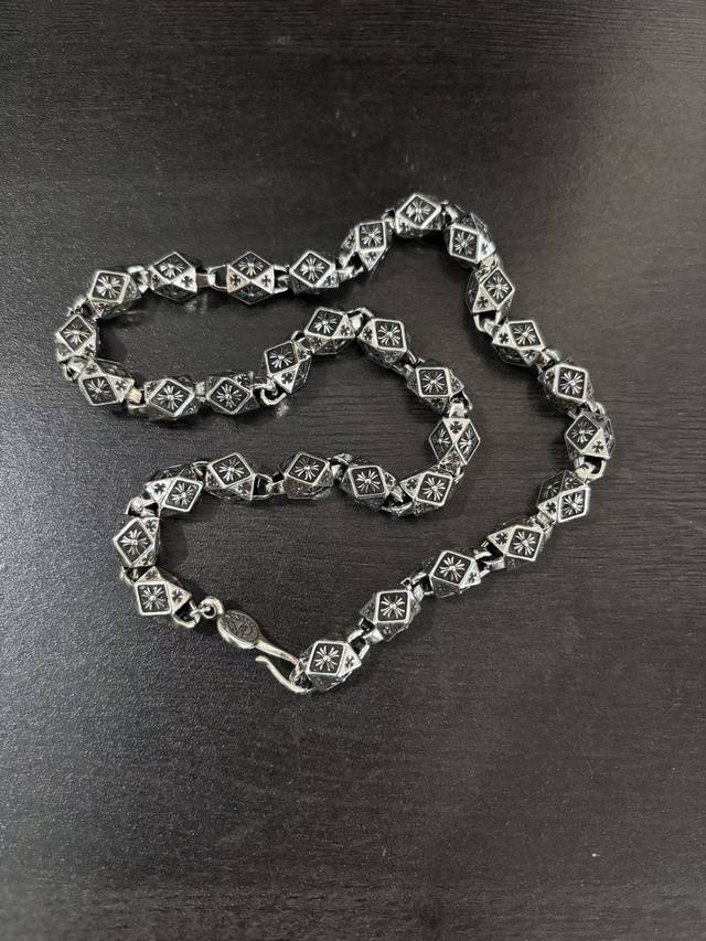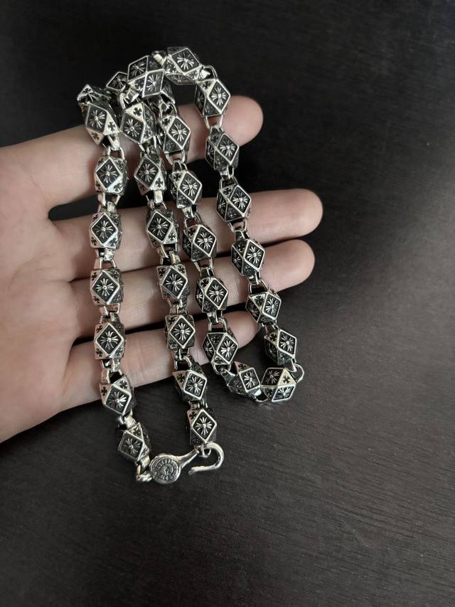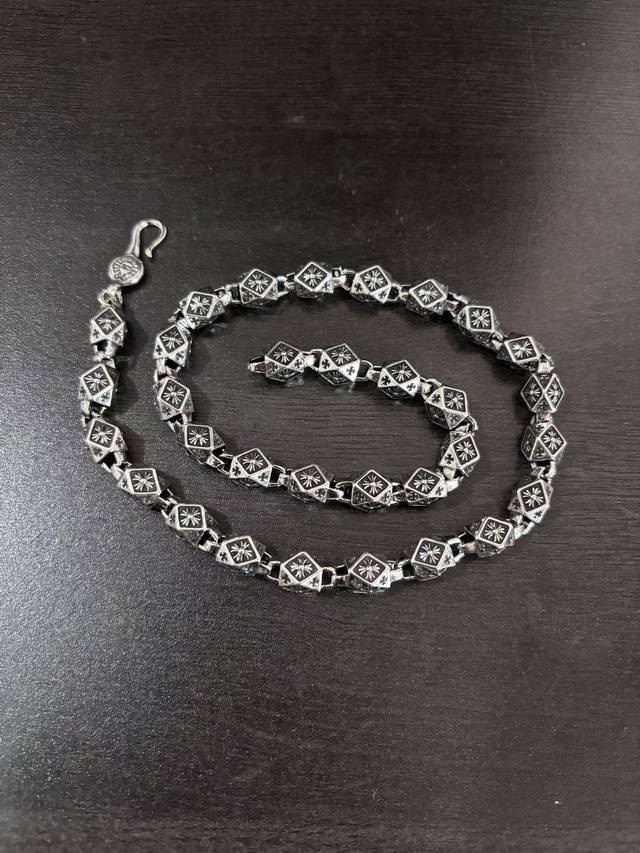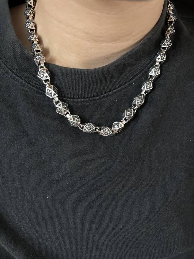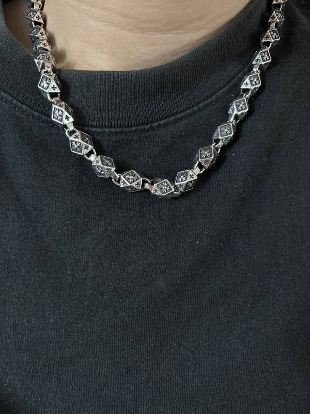 New boutique quality Chrome Hearts classic retro cross chunky necklace. The embossed design and different patterns create a unique look. The cross and scout flower are Chrome Hearts' signature elements, making it timeless. Authentic Chrome Hearts replica, different from ordinary lightweight versions on the market. Quality is top-notch, look at the details of the lettering and the vintage distressed finish. Exquisite craftsmanship! Purely handmade