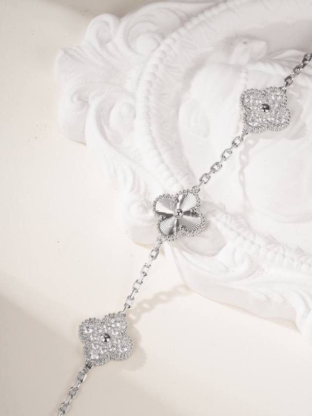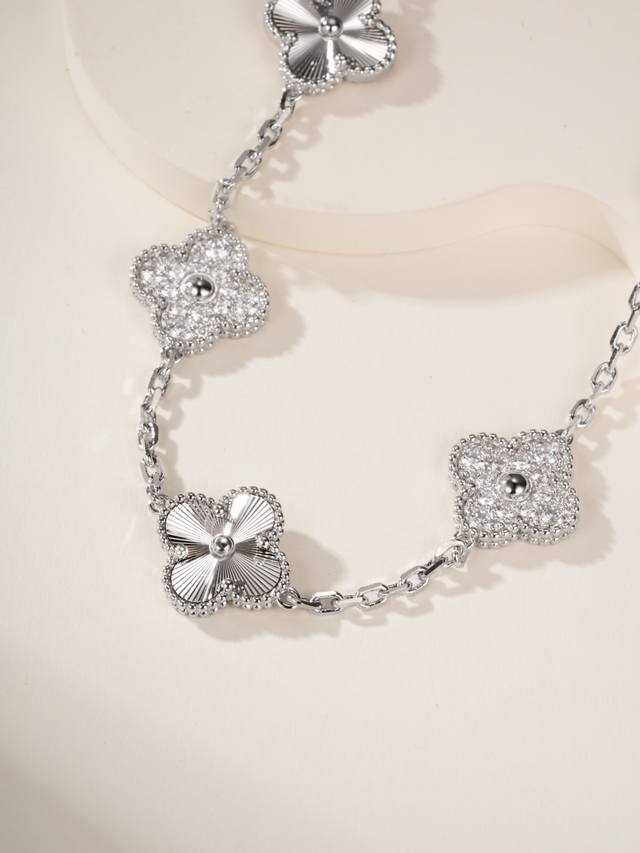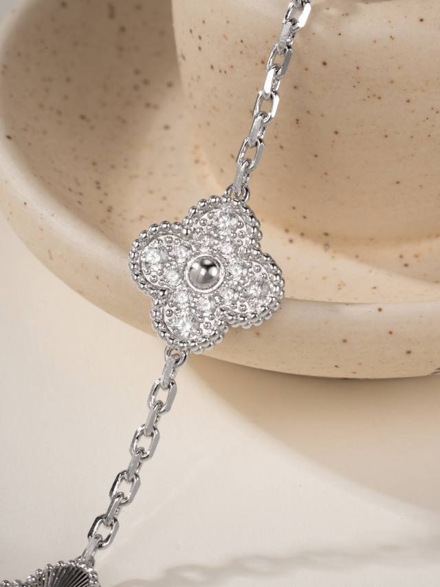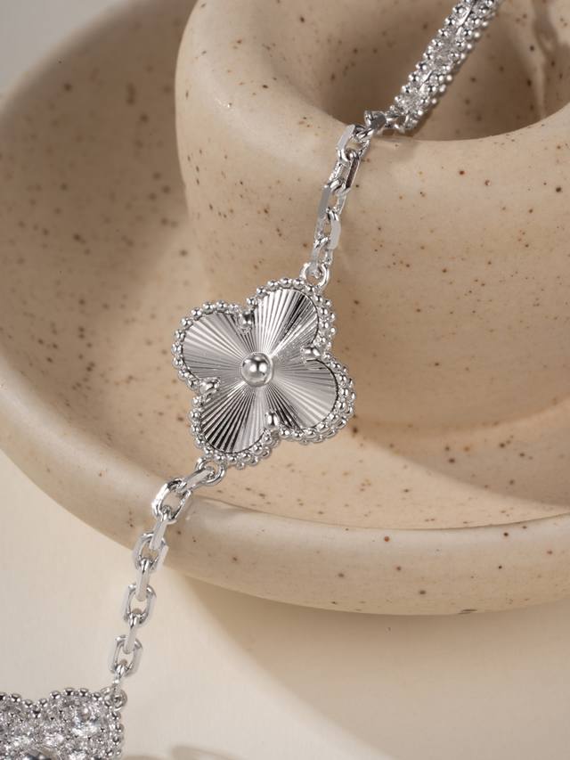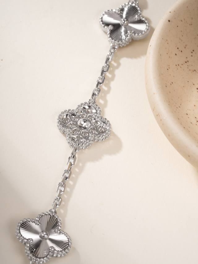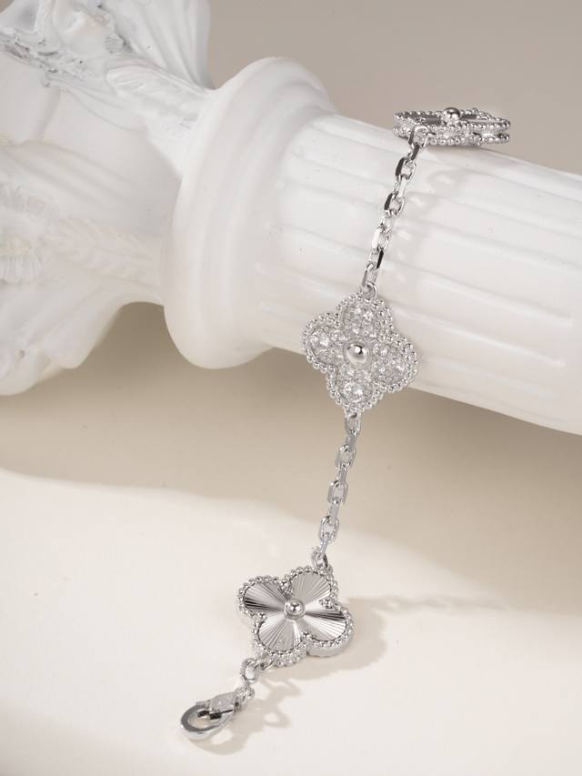 Magic Irregular Pattern Four-Leaf Clover Bracelet features a classic four-leaf clover lucky design, with different sizes and patterns. The combination of high-quality carved sequins and rhinestones creates a very attractive three-dimensional effect. The