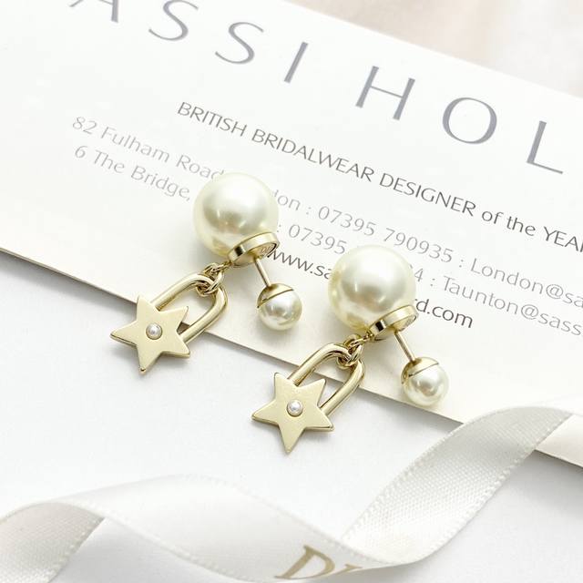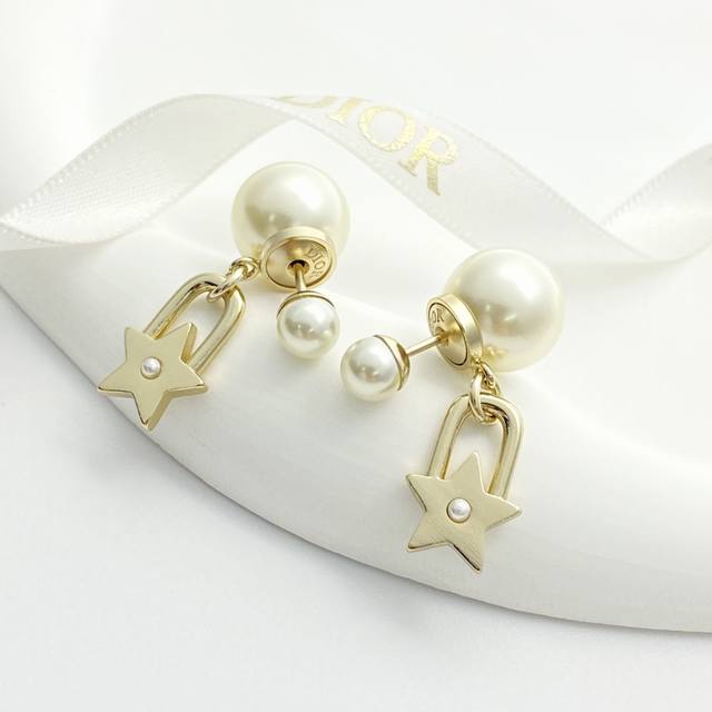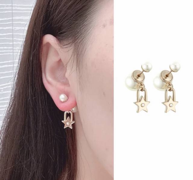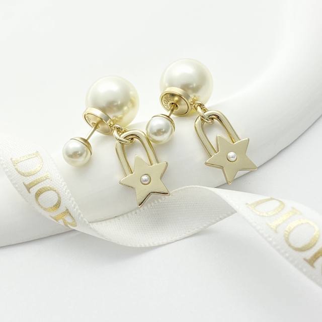 Dior Light Gold Star Lock Double Ball Pearl Earrings