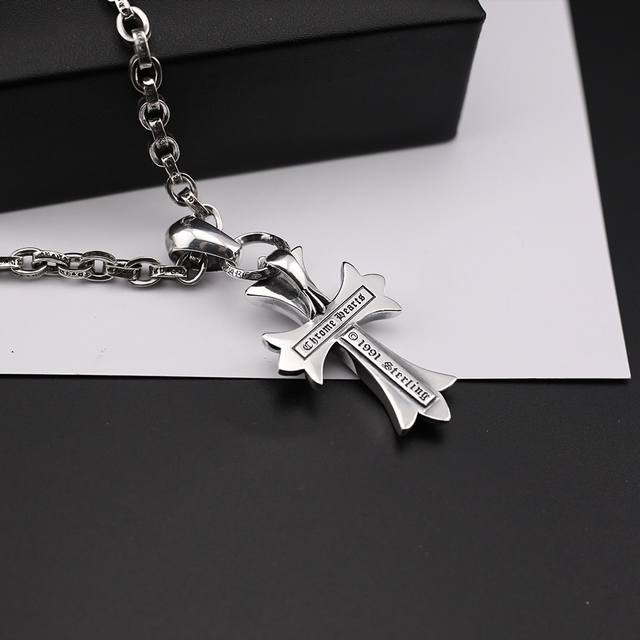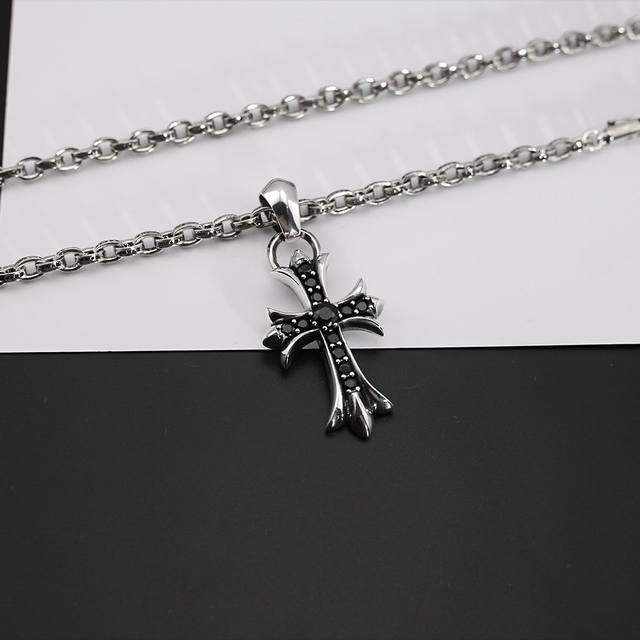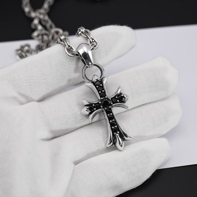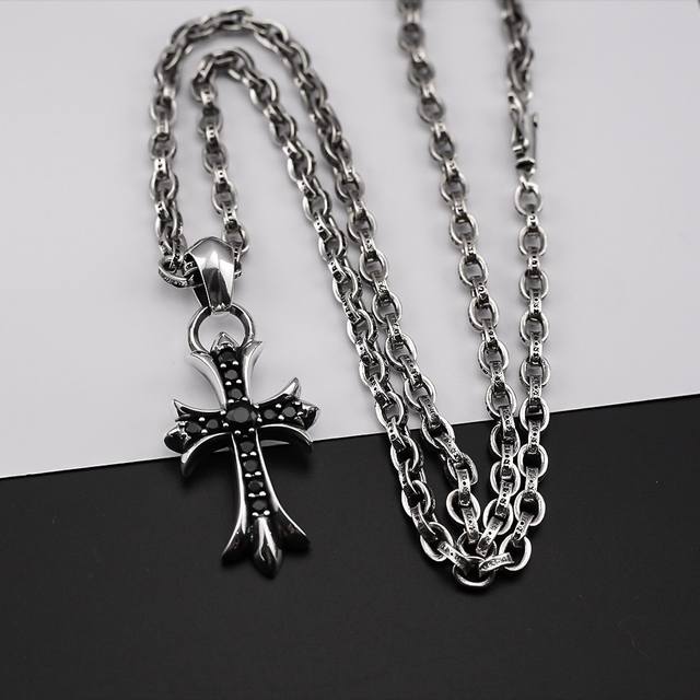 Ch Chro Vintage Black Diamond Cross Heavy Inlaid Letter Necklace Punk Unisex European and American Style Thai Silver Necklace Http DDD