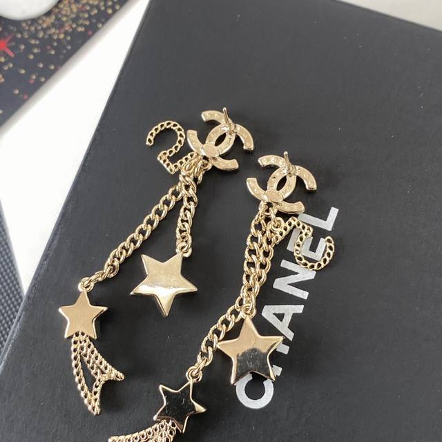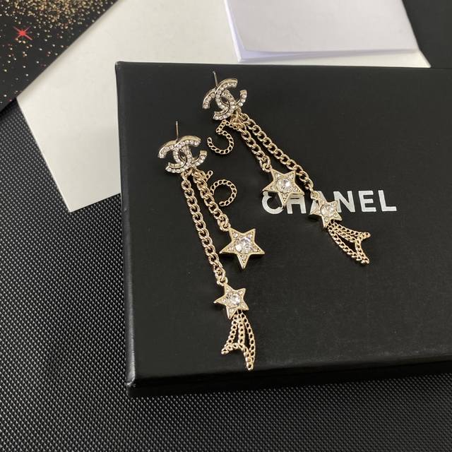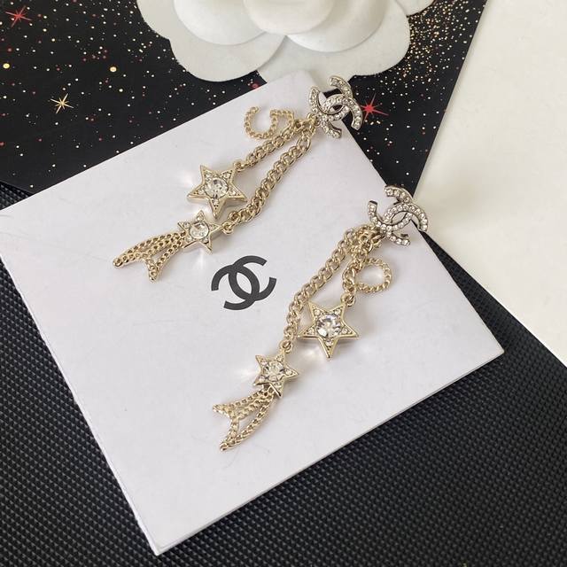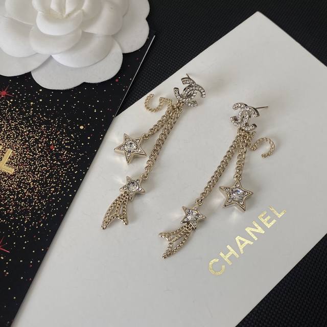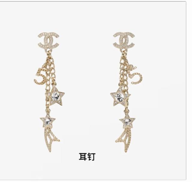 New Arrival Sharing: Ch Nel's new 25B hollowed-out combination tassel chain comet pearl letter earrings feature light gold hardware paired with various classic hollowed-out patterns and crystal inlays. The design is novel and fashionable, yet exquisite.