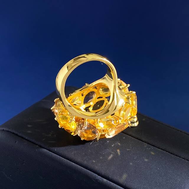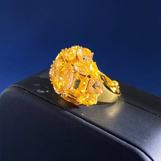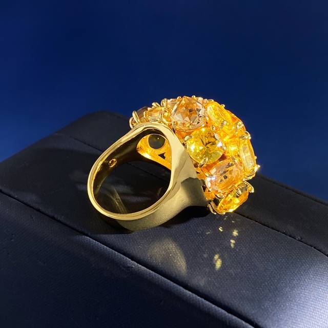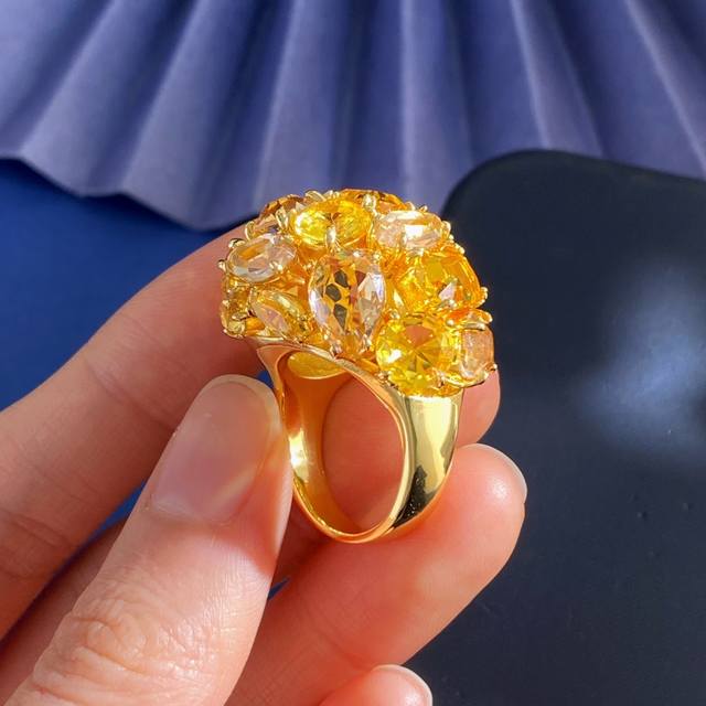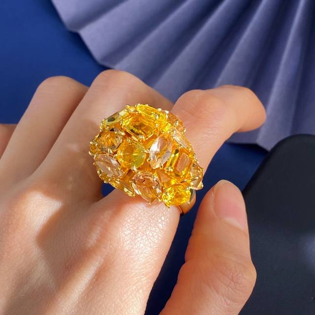 Swarovski Gema Series European and American Fashion High-End Hollow Design Teardrop Shaped Yellow Mixed-Cut Crystal Diamond Ring, Brass Material, Approx. 16.2G, Size 678 DDD