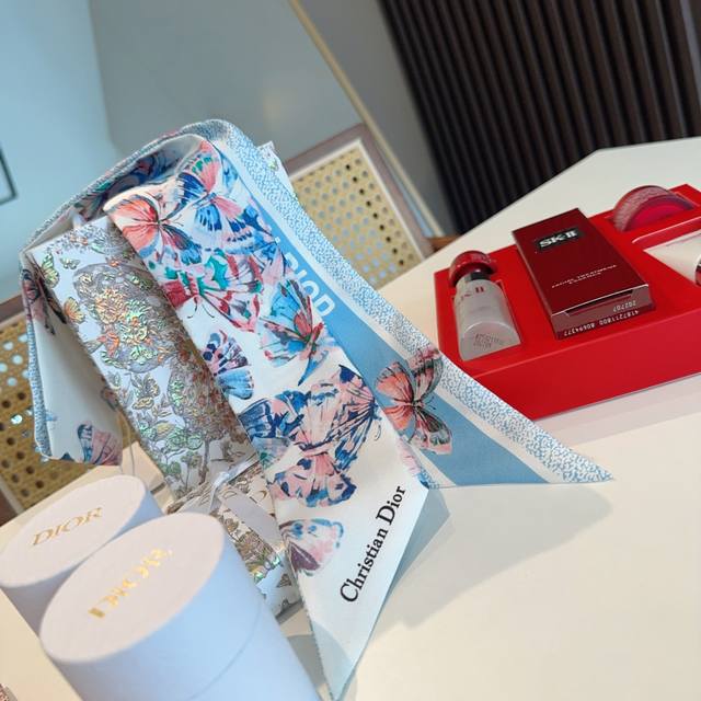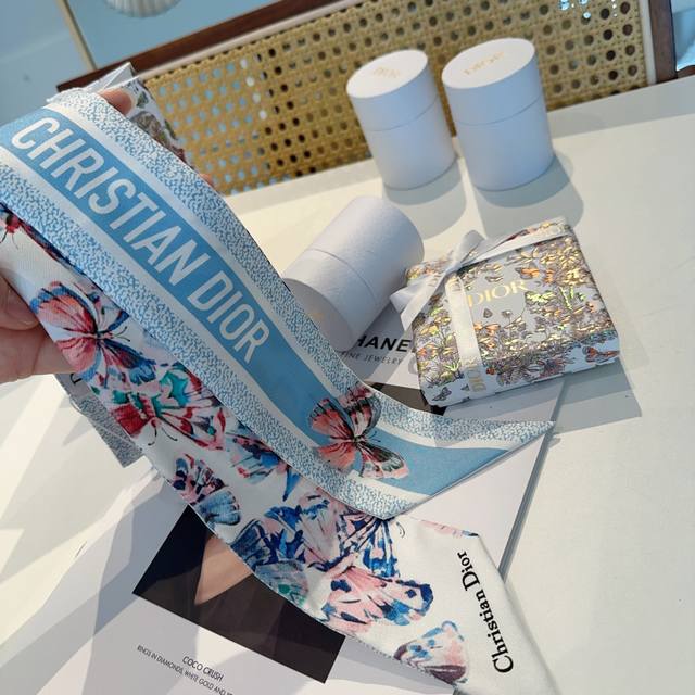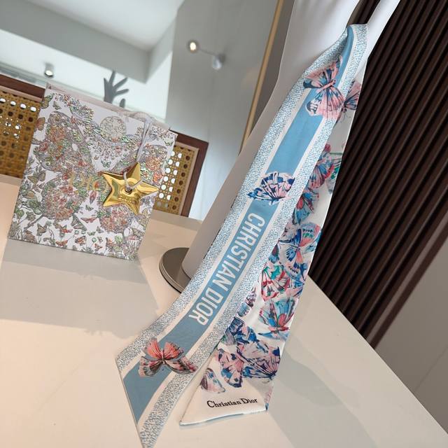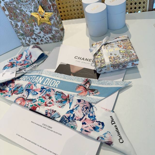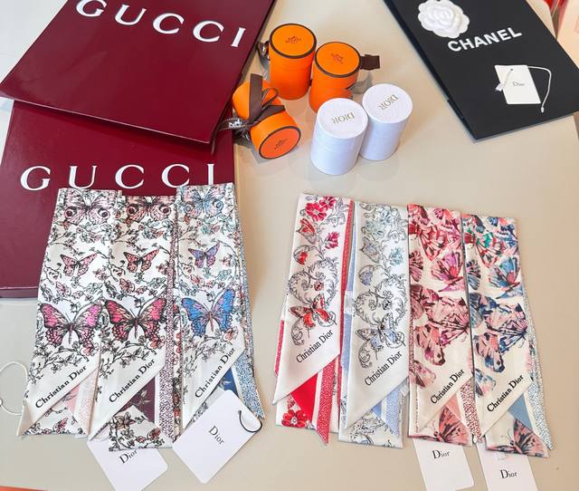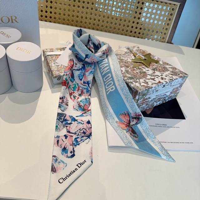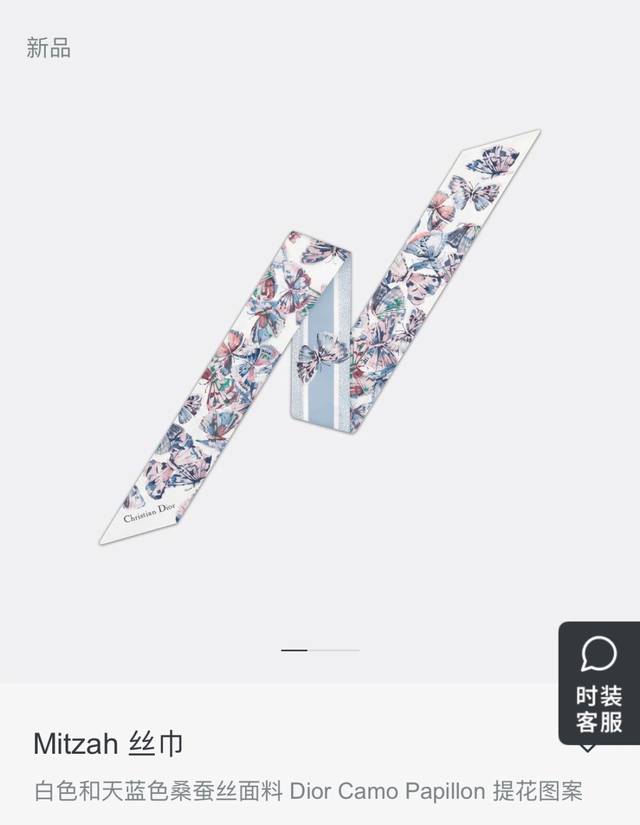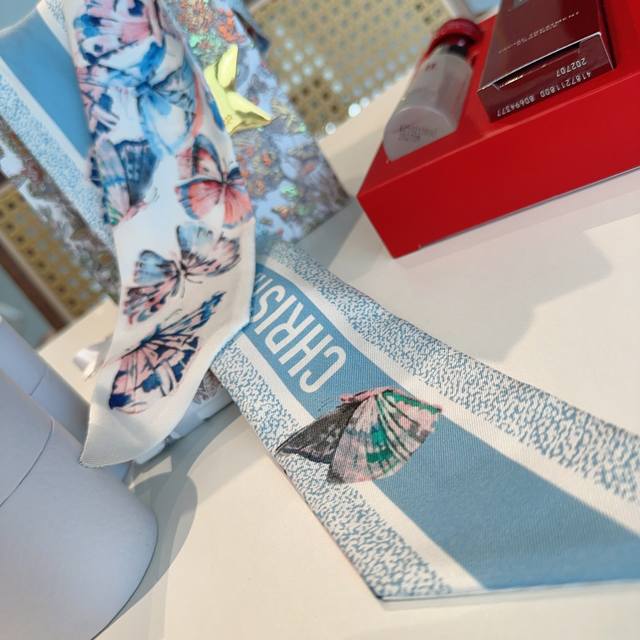 This white and pale pink mulberry silk jacquard Mitzah scarf, adorned with the Dior Camo papillon pattern, offers an elegant and poetic reinterpretation of the butterfly theme. A classic, elongated design with pointed ends, the back features a contrasting pale pink jacquard stripe pattern, embellished with butterflies and the Christian Dior logo. It pairs perfectly with various stylish looks, whether worn around the neck, wrist, or on a handbag, making it the ideal finishing touch. DDD White and pale pink fabric, Dior Camo papillon pattern DDD Contrasting pale pink jacquard stripe pattern on the back, embellished with butterflies and the Christian Dior logo DDD Pointed ends DDD 100% Mulberry Silk DDD Made in Italy DDD