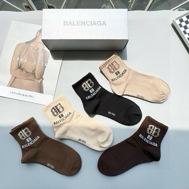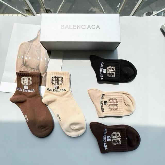 A box of five Balenciaga socks, including packaging. High-quality and incredibly stylish mid-calf socks from this top European and American brand, perfect for men and women. A must-have for trendsetters! These are high-quality mid-calf socks, perfect for department store purchases. They create a super sophisticated and fashionable look! Highly recommended! A must-have fashion item!