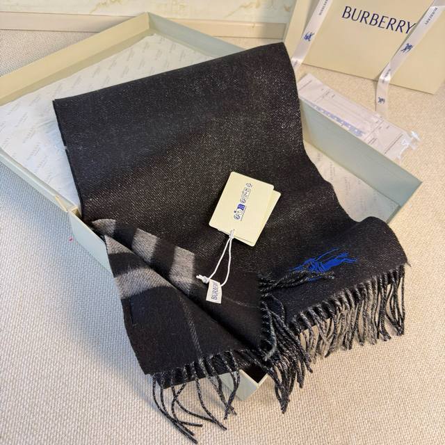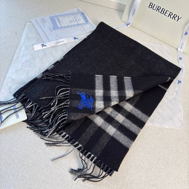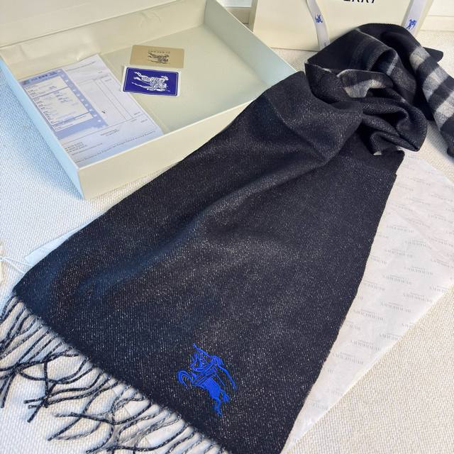 Burberry Double-Sided Check Cashmere Scarf with Metallic Thread. Exquisitely luxurious, one side features the classic cashmere check pattern, while the other is a solid color inlaid with gold and silver threads, adorned with the new blue equestrian embroidery