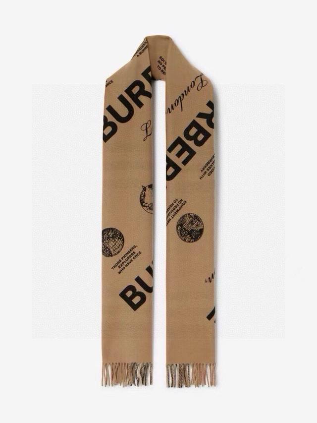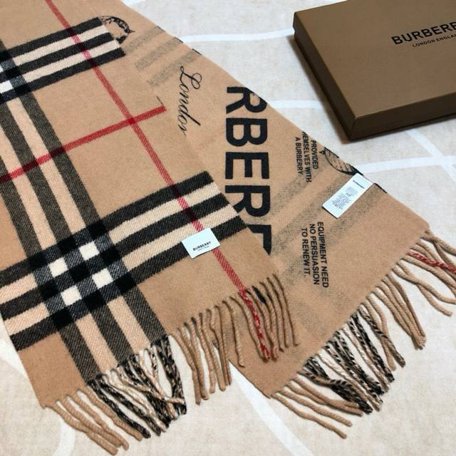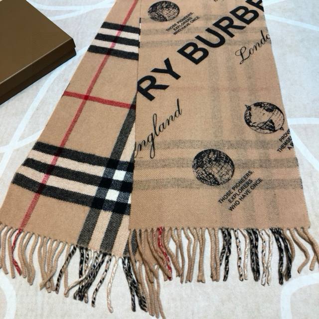 Burberry Reversible Label Print Cashmere Scarf, Made in Italy, crafted from soft cashmere. One side features the Burberry check pattern, while the other is adorned with a label print, paying homage to the brand's history of exploration. The text is excerpted from Thomas Burberry's book, *Pioneering Space*. Dimensions: 168 x 30cm Cashmere Rectangular Tassel ends Dry cleanable Made in Italy