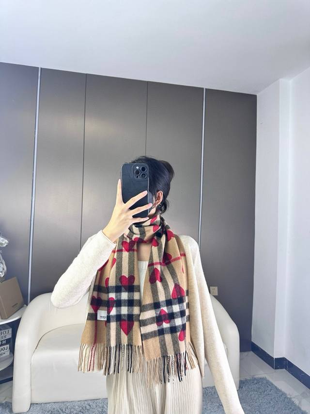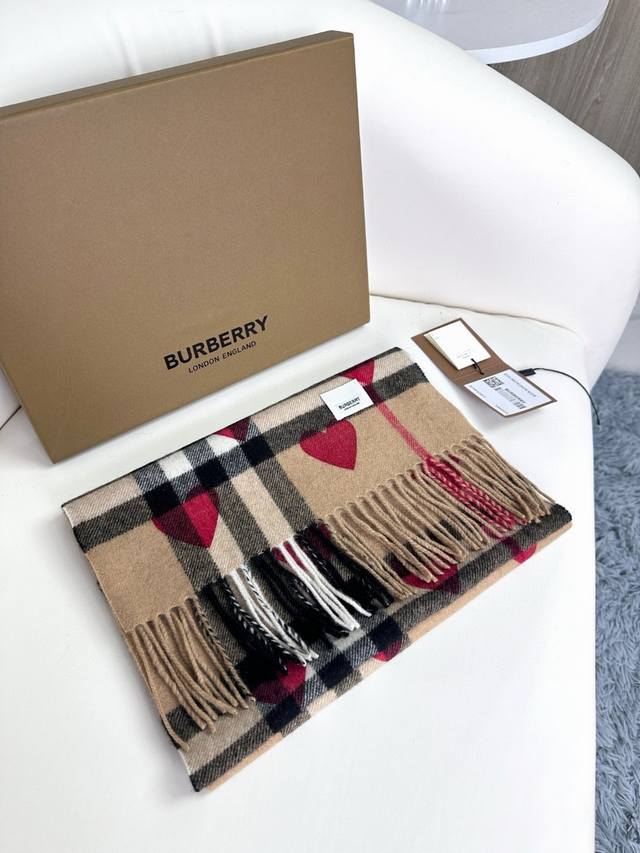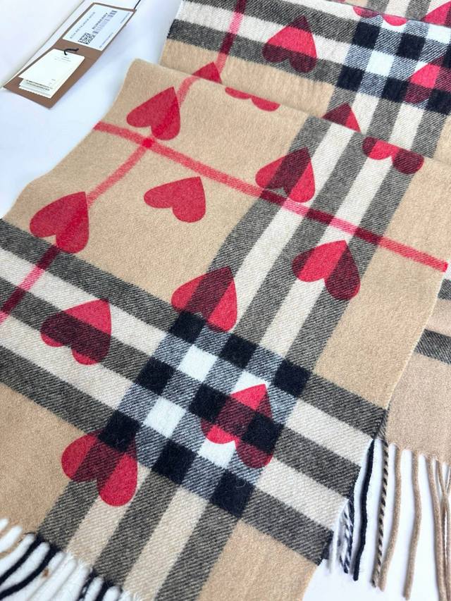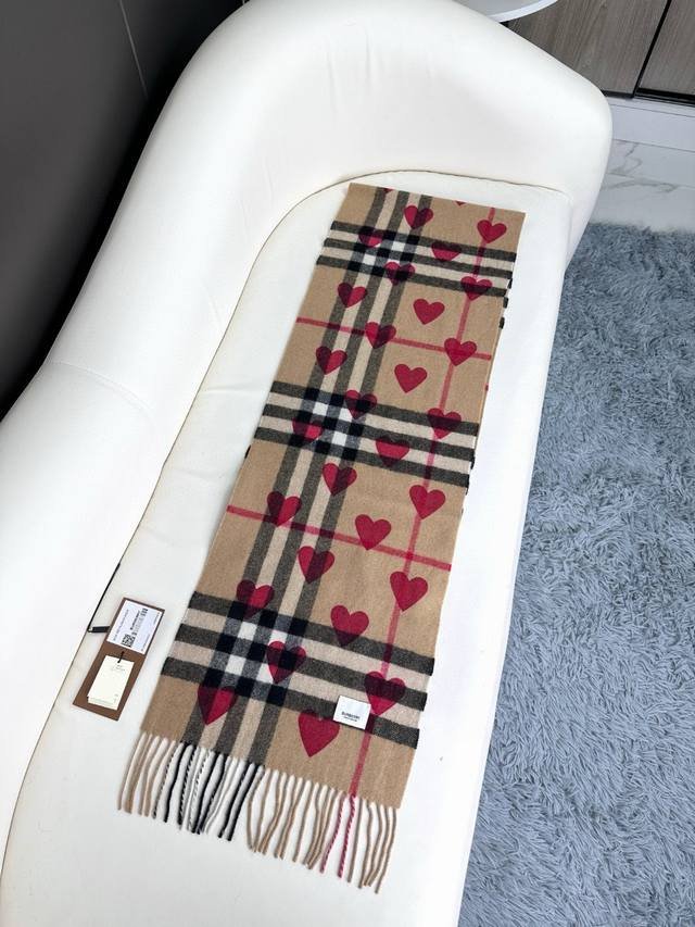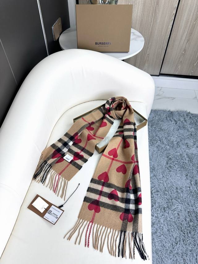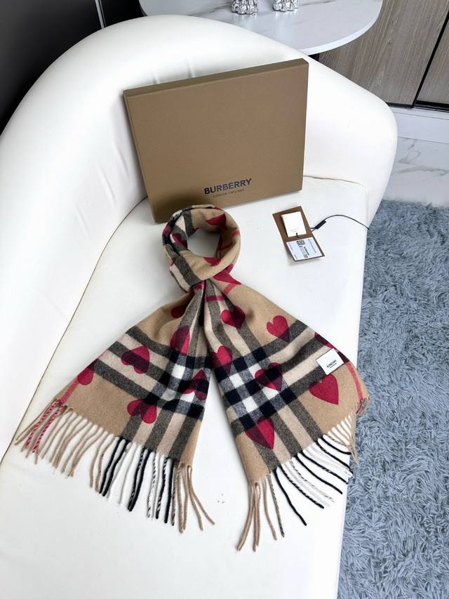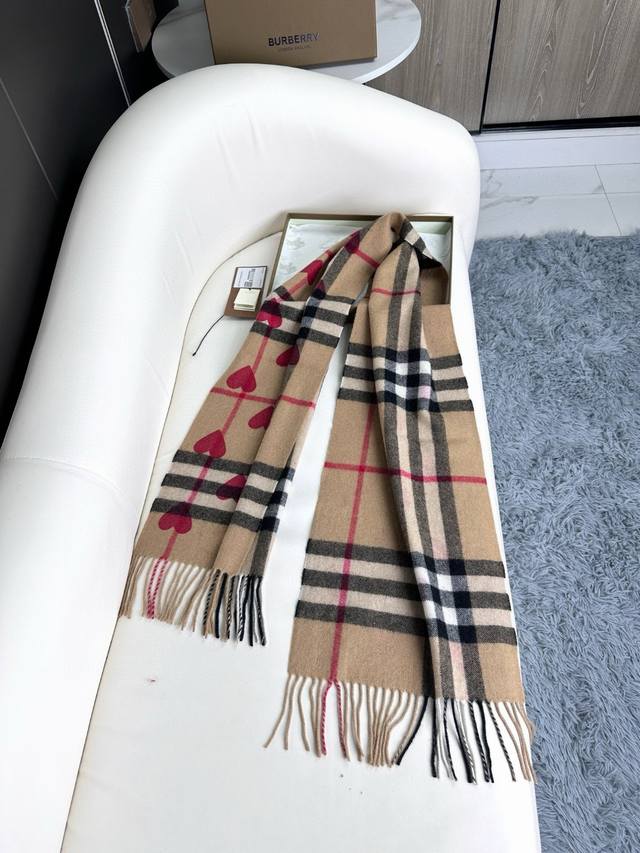 Burberry's classic cashmere heart scarf is a year-round staple, a must-have in any wardrobe, and its most frequently seen item. This Burberry cashmere scarf is suitable for both men and women. A classic, versatile scarf is essential for this season. The more classic the item, the more meticulous the craftsmanship; don't compromise on quality with a blended fabric. The soft texture of cashmere is incredibly gentle against the skin. Size: 30*168 cm (excluding tassels). Fabric: % Cashmere.