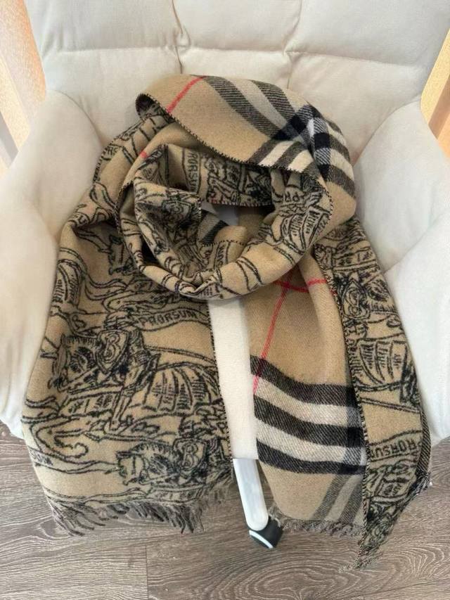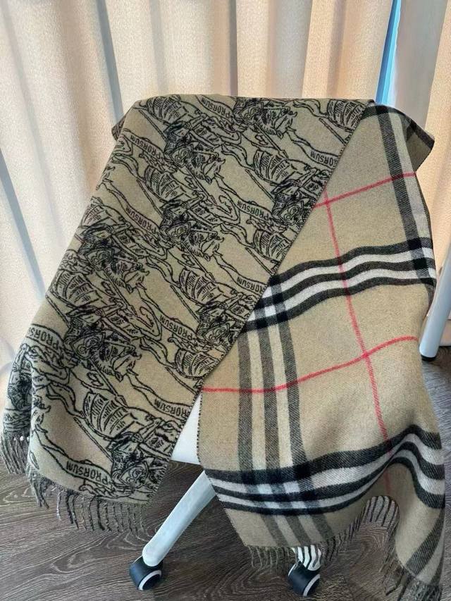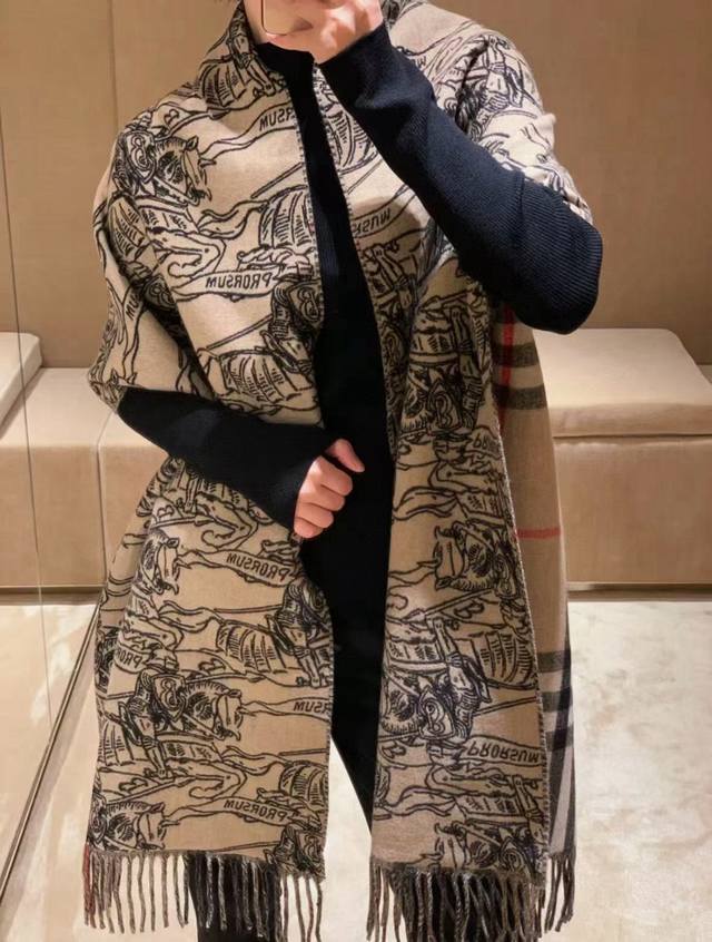 High-end chip version of the Burberry Equestrian Knight double-sided cape, beautiful in every way, hailed as Burberry's most beautiful style this year. This classic stone-colored plaid cape features the iconic jacquard equestrian horse logo. This refined scarf is crafted from jacquard worsted cashmere fabric and features the brand's oversized plaid and equestrian knight design, showcasing Burberry's signature style.