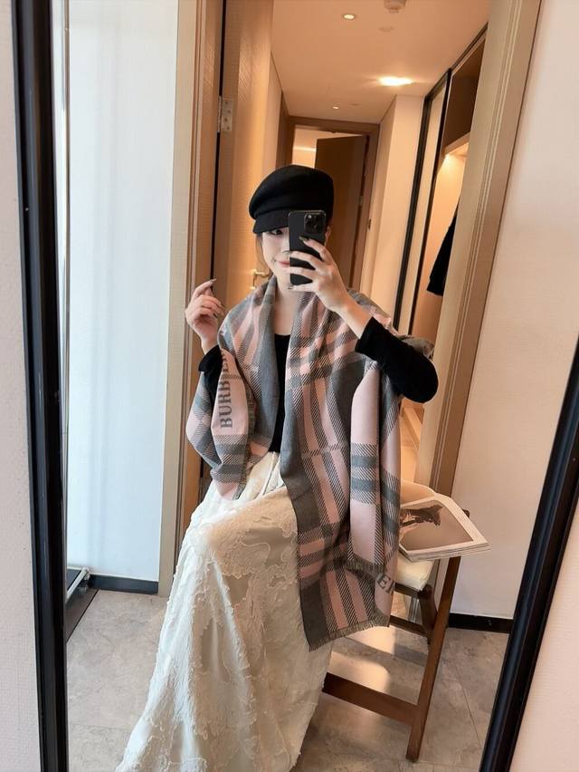 This Burberry reversible scarf is absolutely gorgeous! It's so stylish and charming, a very elegant and fashionable autumn/winter piece! I really love it. It's a very classic women's design, made of 100% lambskin, the feel is simply amazing. It looks good no matter how you wear it! You can buy this style without hesitation; it's easy to wear for any age! 60*200cm (