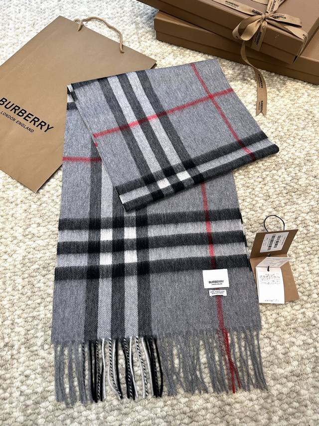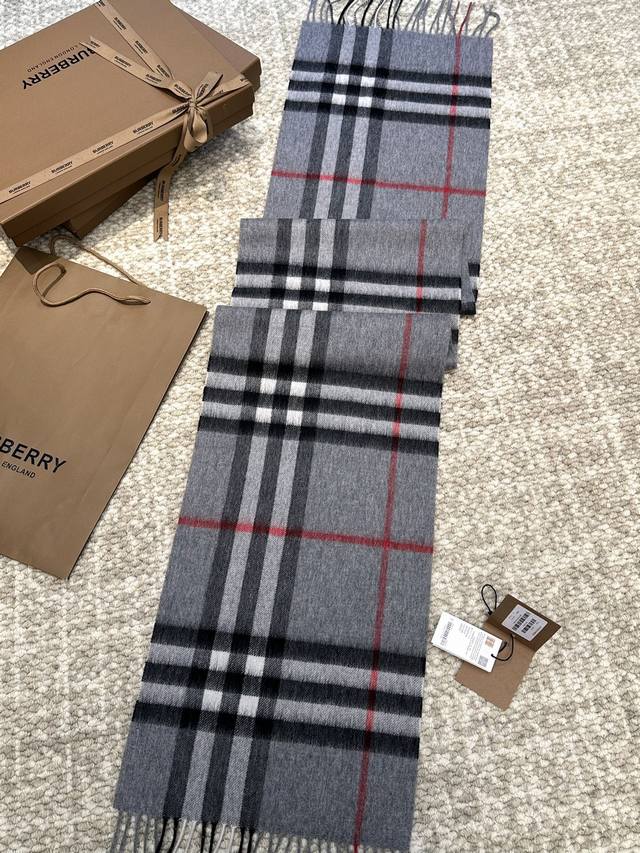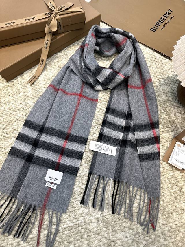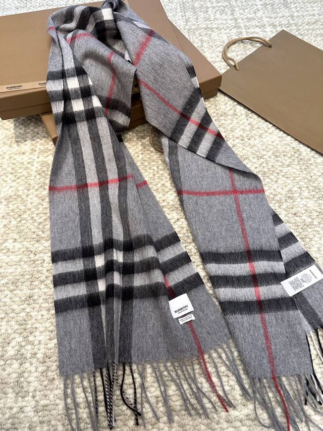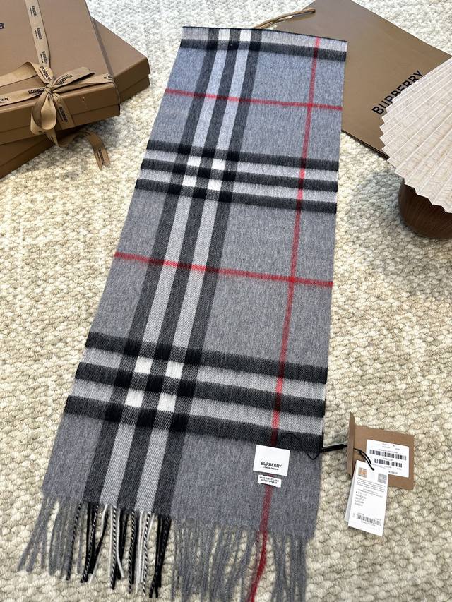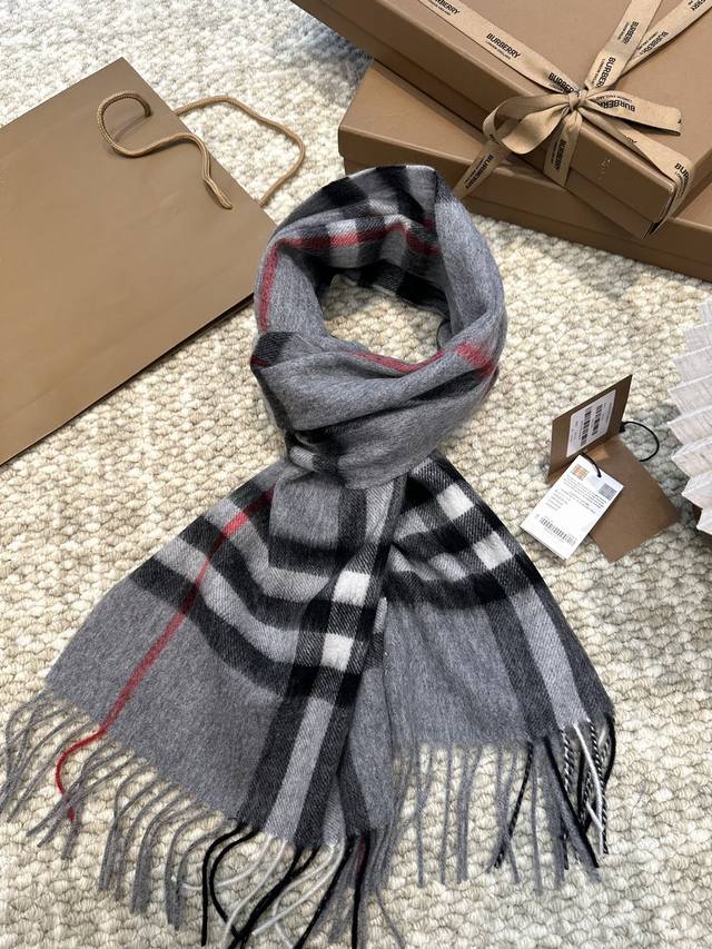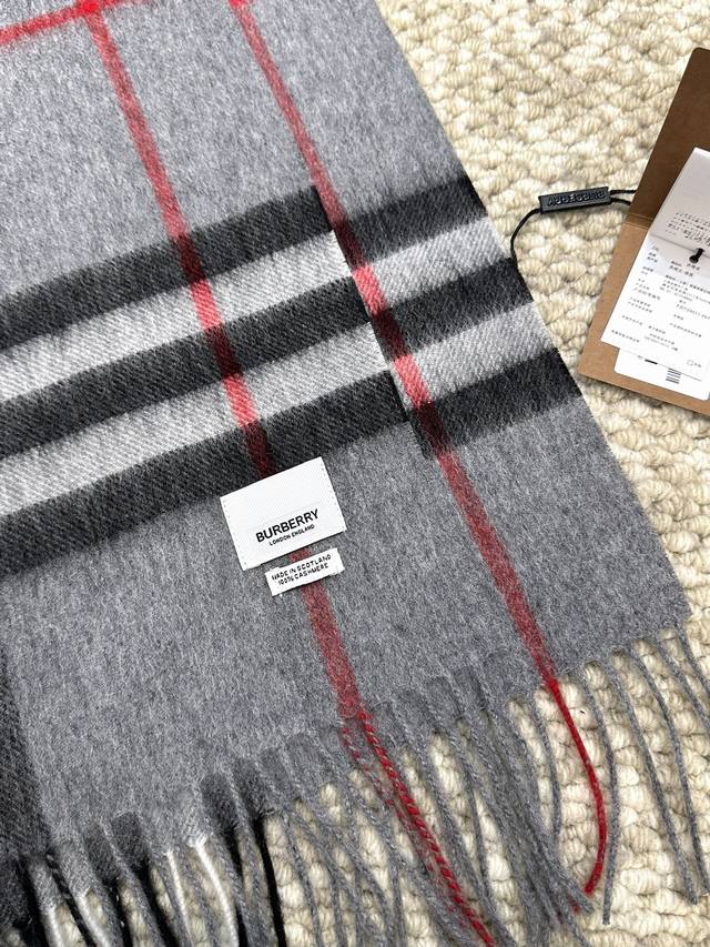 This is Burberry's most classic cashmere check scarf. It completely outclasses any imitations on the market. The order uses only custom-supplied cashmere, with a dense twill weave and a weight of 160 grams. These international orders have very high requirements for craftsmanship, demanding a high weft density in the fabric, so the drape and density are immediately noticeable to the touch. All colors use imported dyes, resulting in top-notch brightness, color saturation, and vibrancy. 100% cashmere. Dimensions: 30*168cm, 7cm*2 tassels. Grab it without hesitation! (