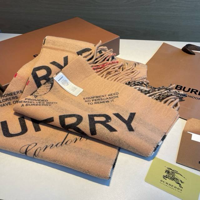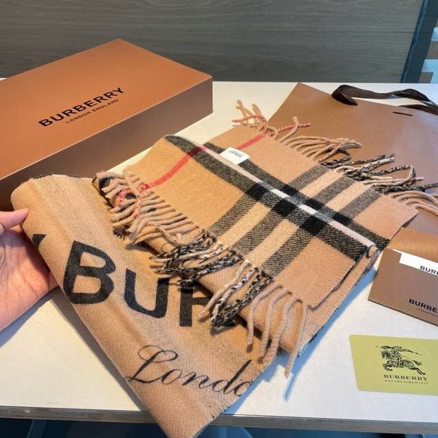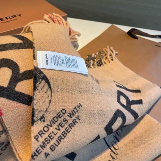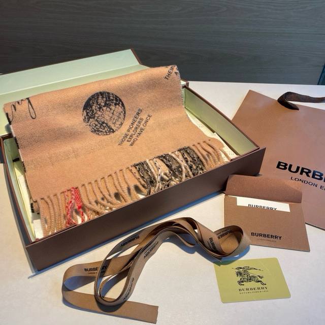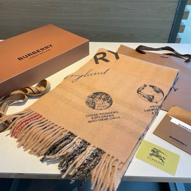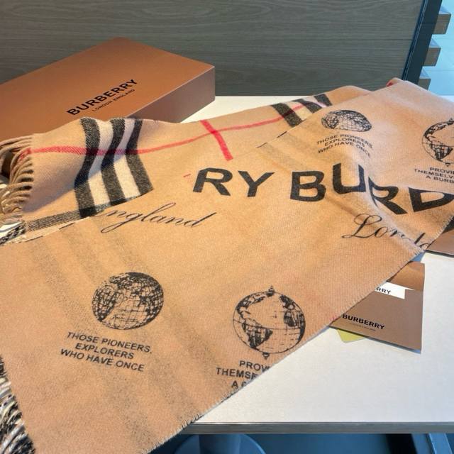This scarf is made in Italy from soft cashmere. One side features the Burberry check, while the other side features a printed label, a nod to the brand's history of exploration. The text is excerpted from Thomas Burberry's book, "Cleaning Up Space."