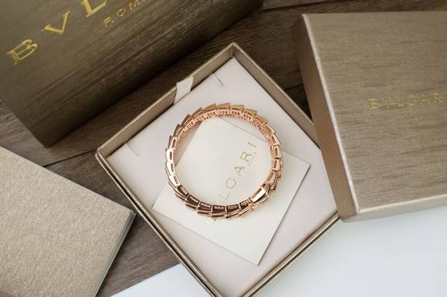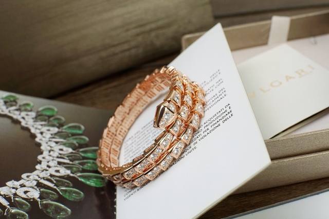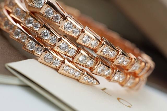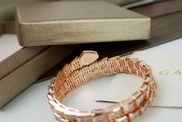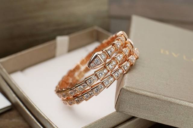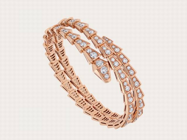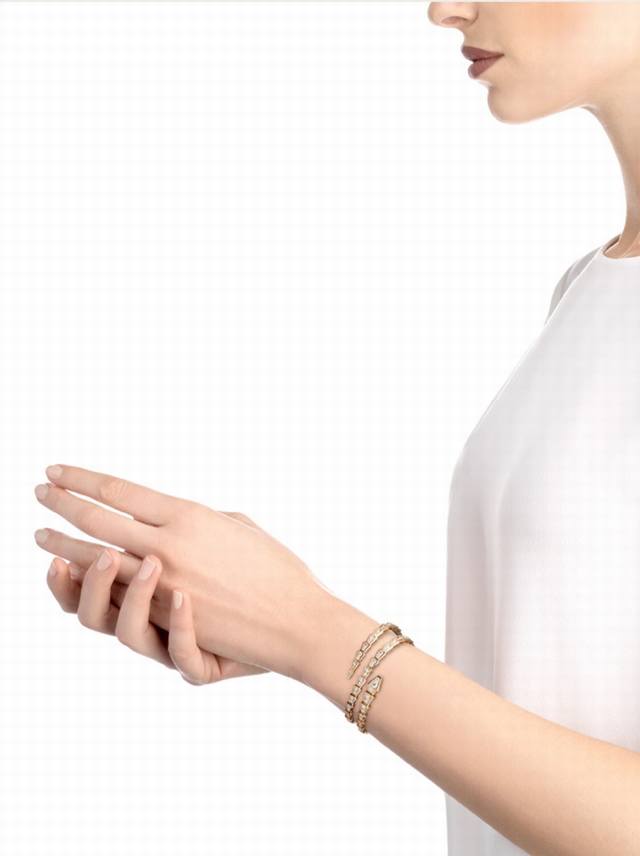 Bvlgari double-circle full-diamond snake bracelet. The delicate and alluring lines of the design are so sophisticated! The exquisite craftsmanship and innovative design make the bracelet a powerful and feminine touch as it wraps around the wrist. (Note: The last part, "