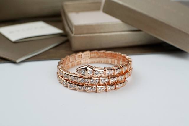Bvlgari's double-loop, full-diamond snake bracelet features delicate and enchanting lines. Its refined, innovative design lingers on the wrist, while the majestic snake shape accentuates femininity.