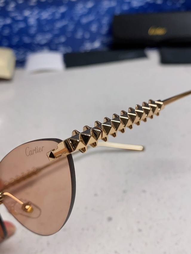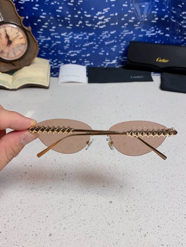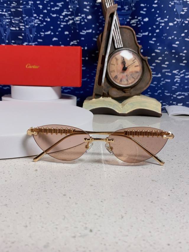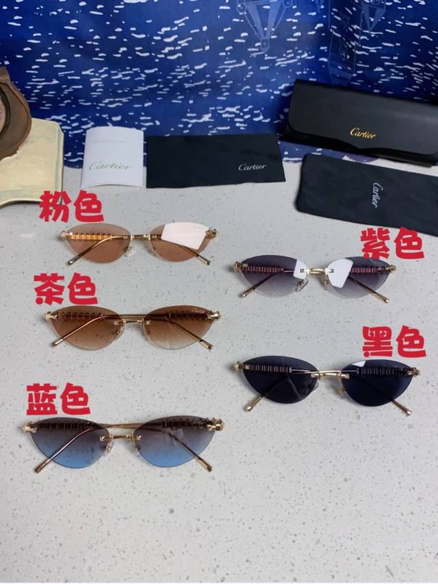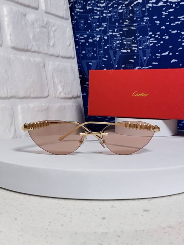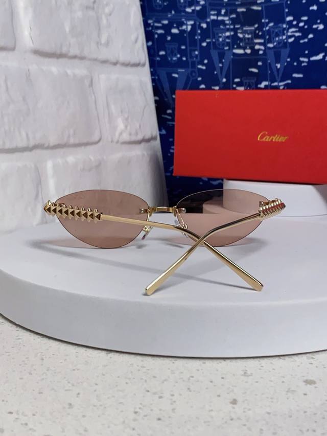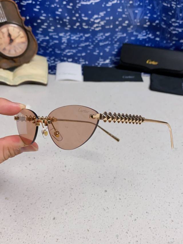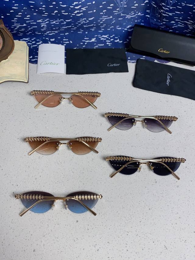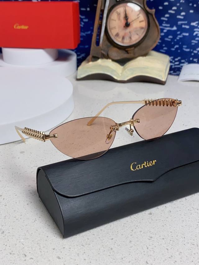 Cartier 2025 European and American luxury women's personalized avant-garde frameless sunglasses, European style, celebrity street style, Instagram influencer fashion cat-eye sunglasses, women's design with metal threaded temples .