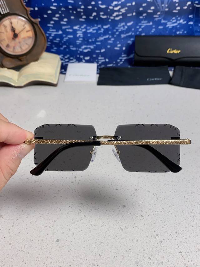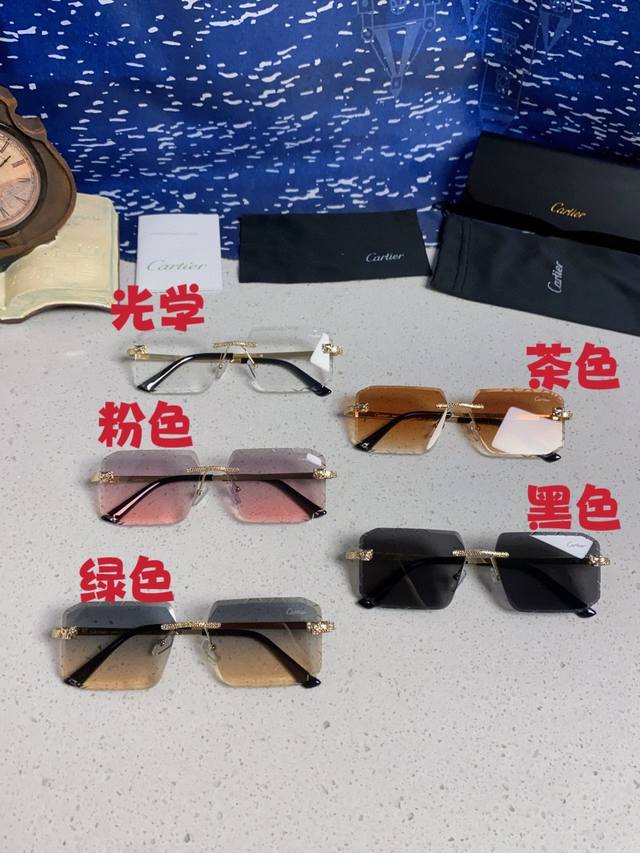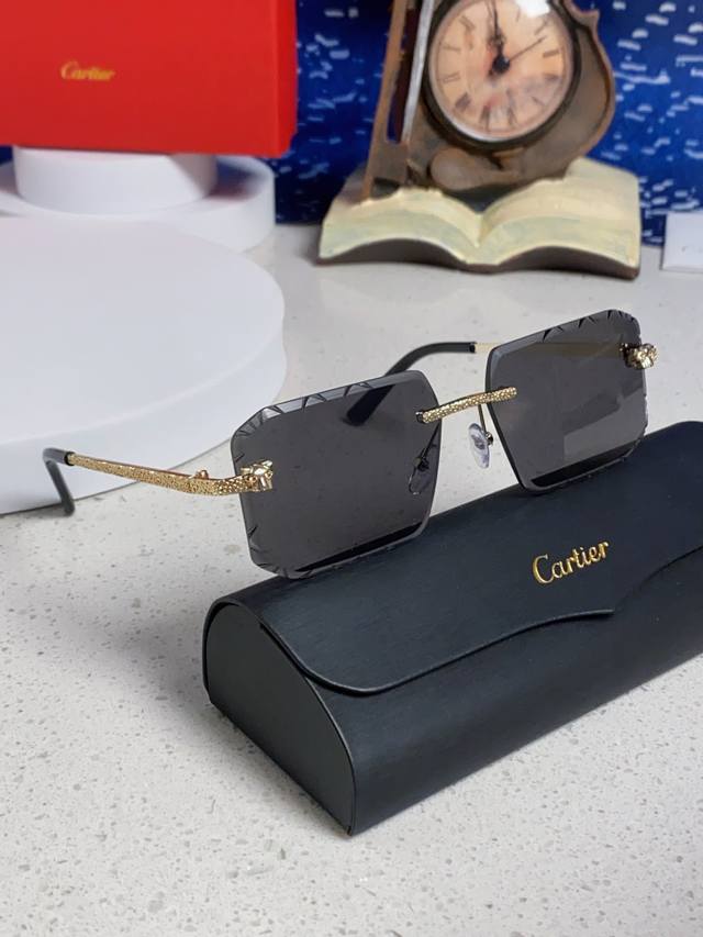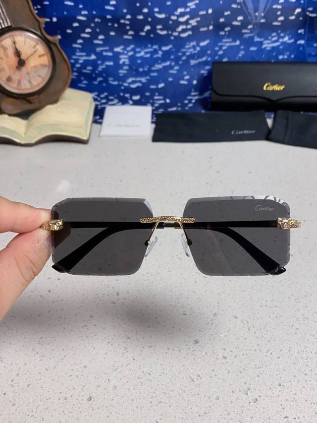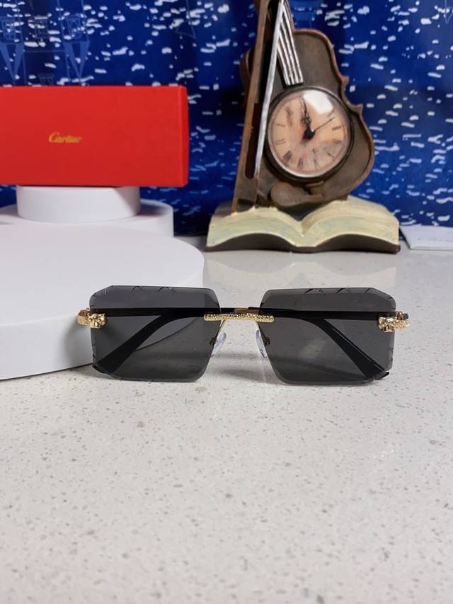 Cartier 2025 New Frameless Beveled Square Panther Head Small Frame Anti-UV Sunglasses Women's Metal Men's European and American Sunglasses Ins Street Style