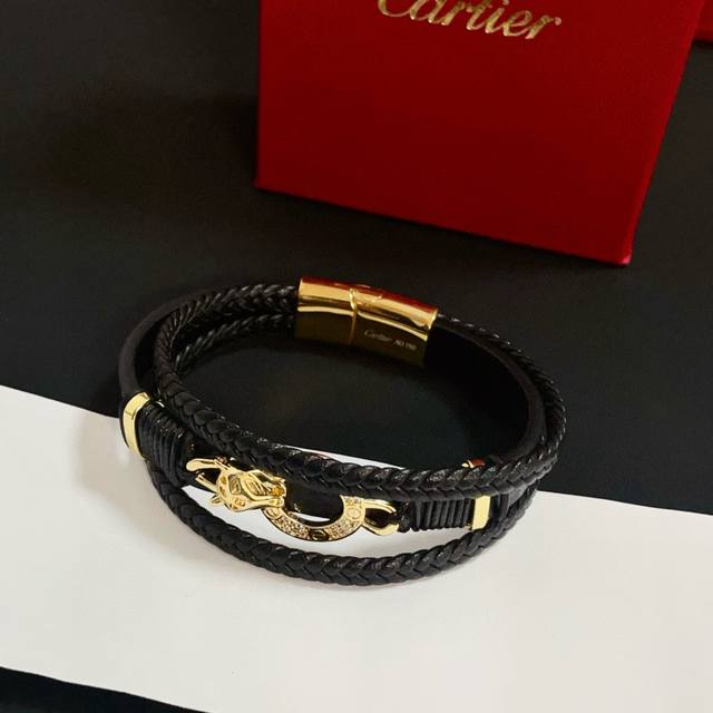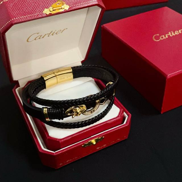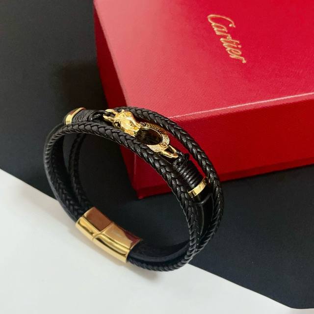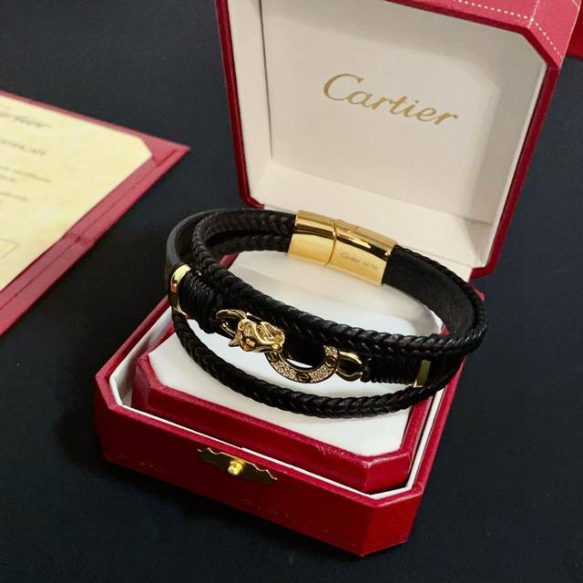 Cartier's panther head diamond-studded leather cord bracelet, a high-end custom version, features diamond-set craftsmanship and V-gold material. Its classic and stylish design reshapes the aesthetics of love with sharp lines! Breaking with convention, the diamond-studded design creates a sense of luxury. Love should remain pure, without extravagance. Cartier is beloved by celebrities and influencers. The panther bracelet is a timeless classic, perfect for men and women of all ages! Wear it and you'll be the center of attention!