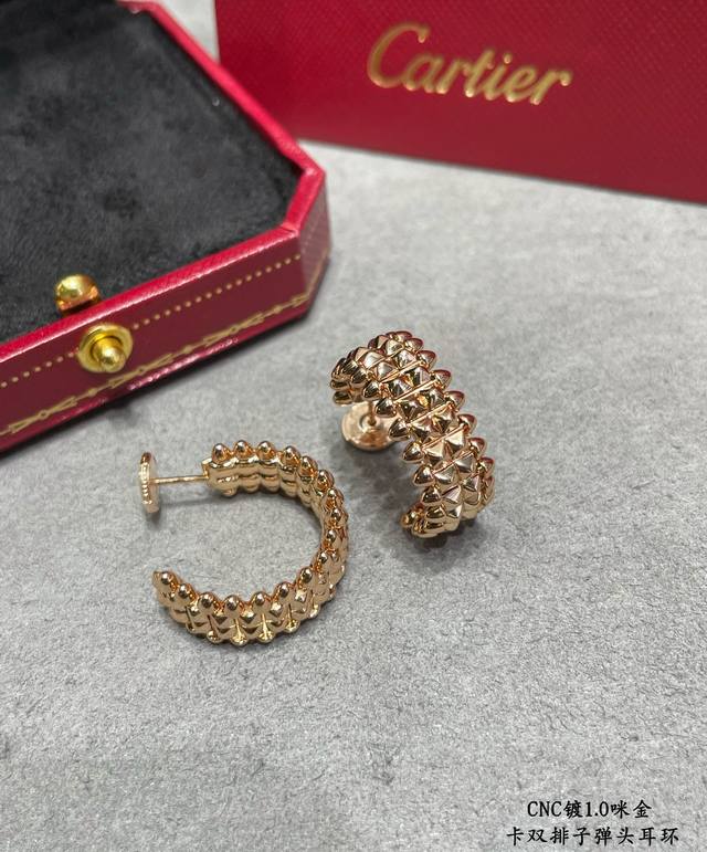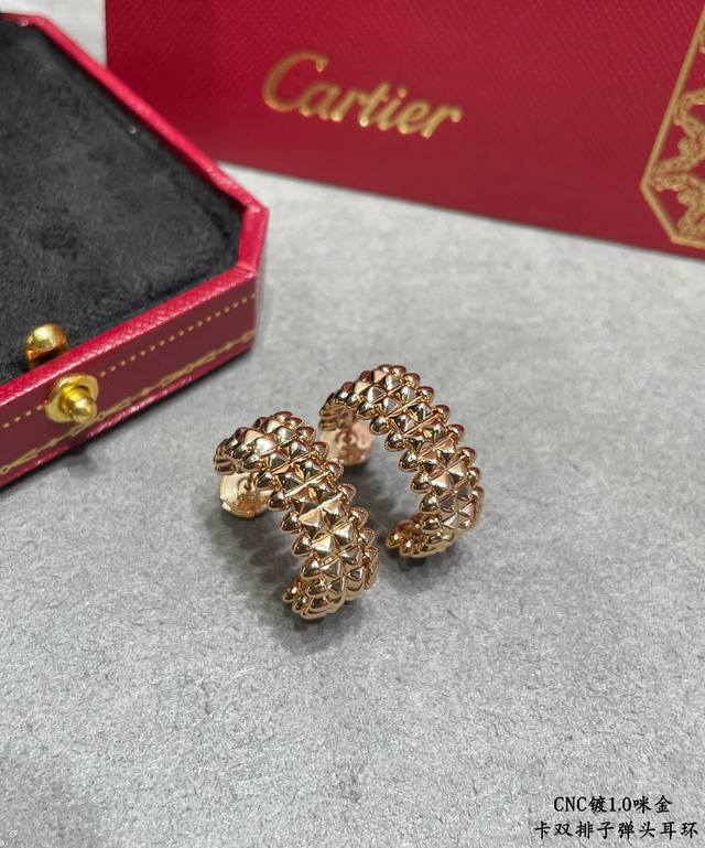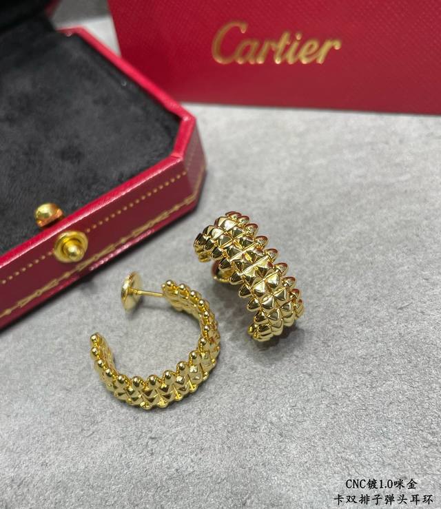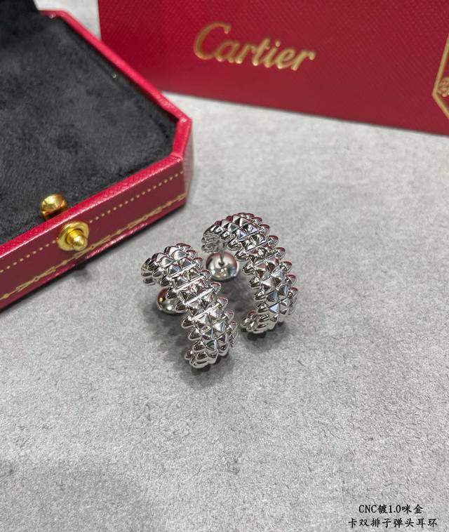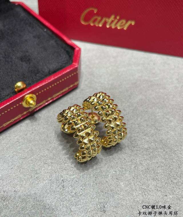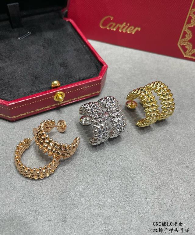 V-plated gold and white gold Cartier CNC double-row bullet earrings, out of stock. Features original UFO-shaped earbuds with small rivets on either side that can move freely, making them a very unique piece. A timeless classic, very popular in recent years. High-end micro-inlaid design, same material, different price. Real gold texture.