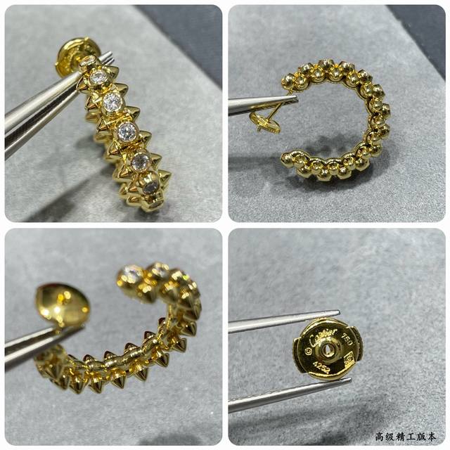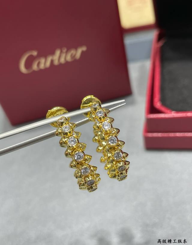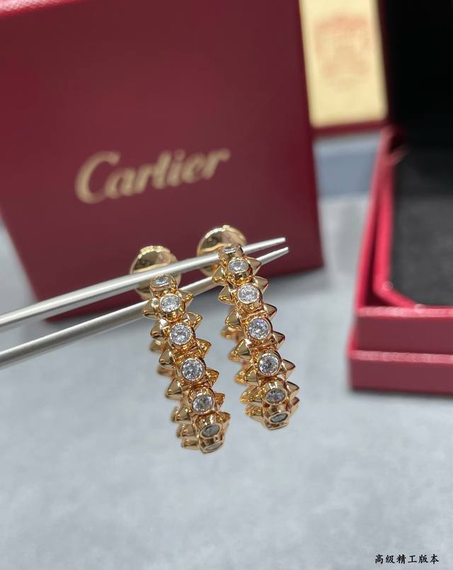 V-shaped gold-plated Cartier CNC diamond-encrusted bullet earrings, featuring original UFO-shaped ear tips with small rivets on either side that can sway freely, a very unique piece. A timeless classic, popular in recent years, high-end micro-inlaid designs with the same materials and craftsmanship but at a different price. Real gold feel.