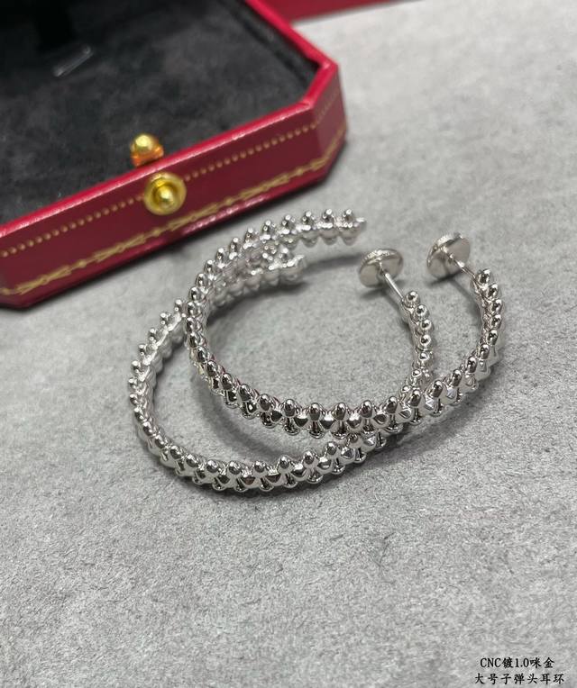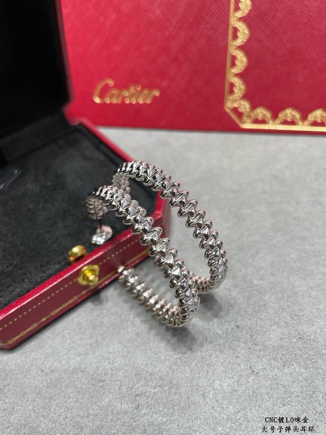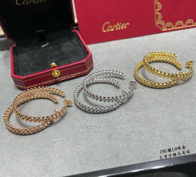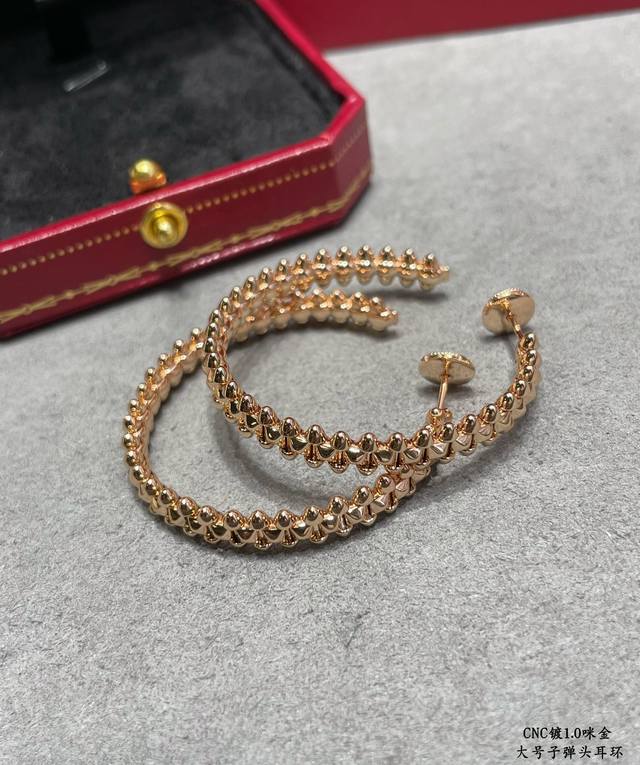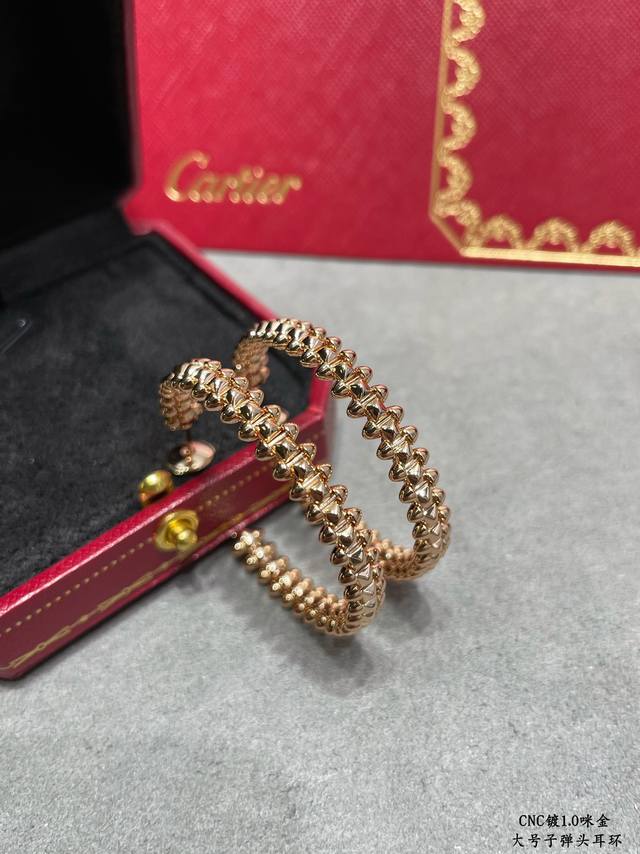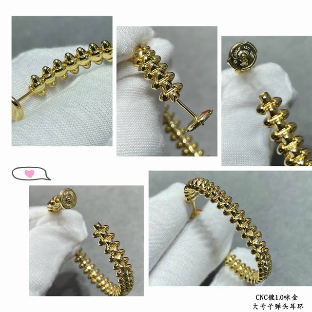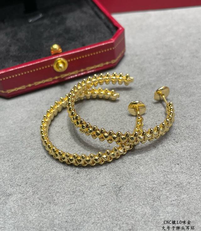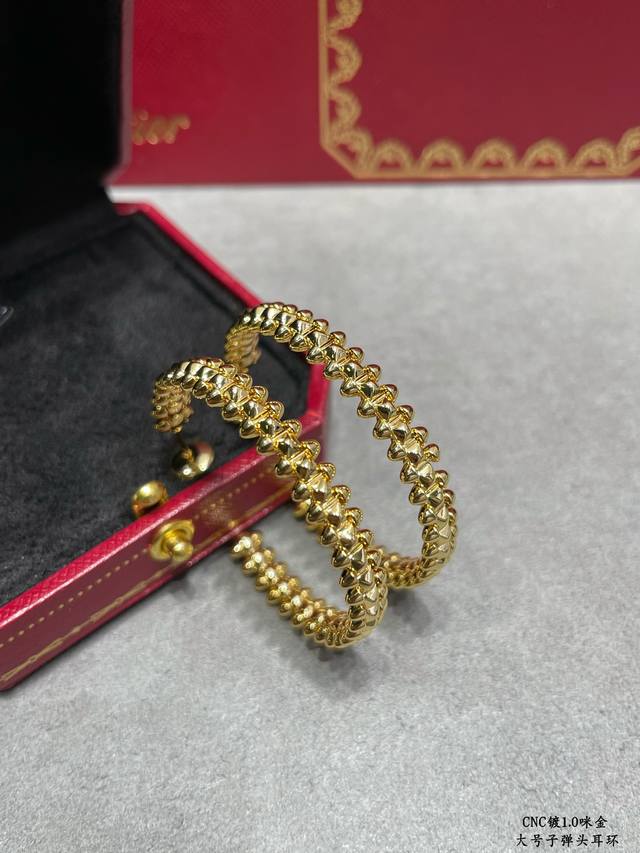 V-shaped gold-plated Cartier CNC large bullet earrings, featuring original UFO-shaped ear tips with small rivets on either side that can swing freely, a very unique piece. A timeless classic, popular in recent years, high-end micro-inlaid design with the same material and craftsmanship but a different price. Real gold feel.