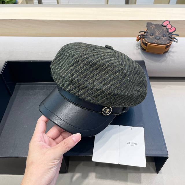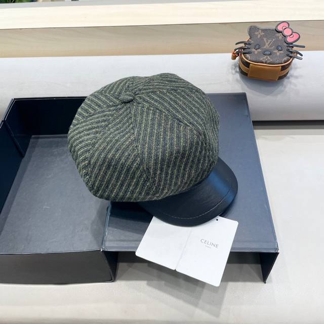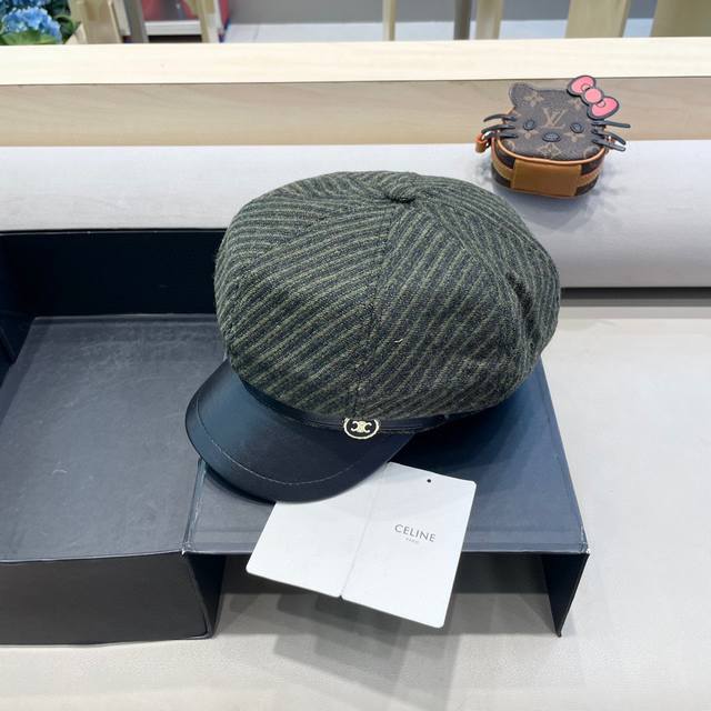Celine Japanese elegant mixed color tweed leather brim octagonal hat thick warm painter hat fashion newsboy hat autumn and winter beret
