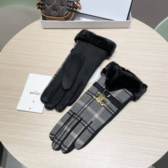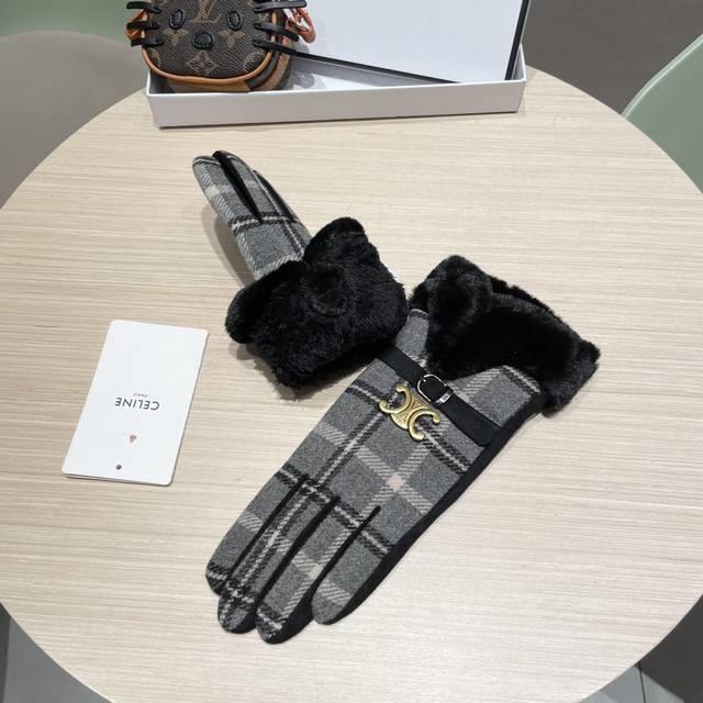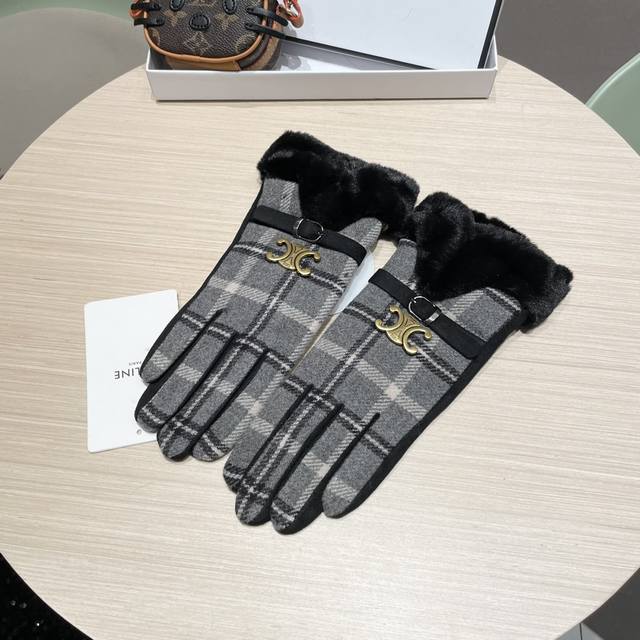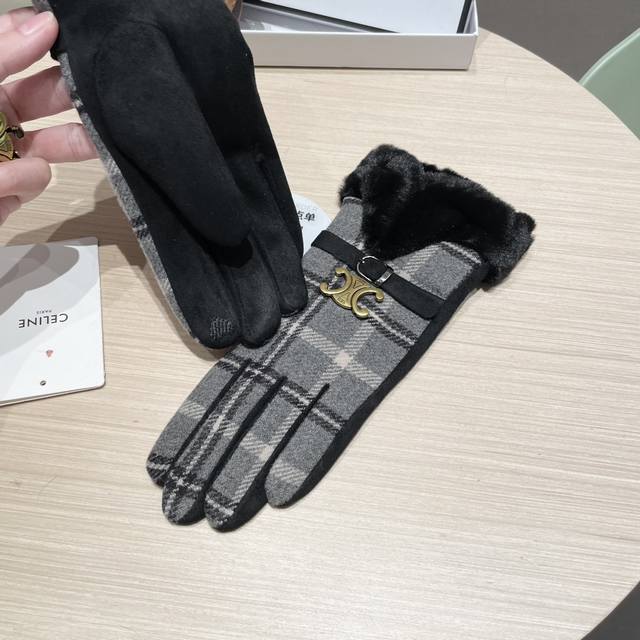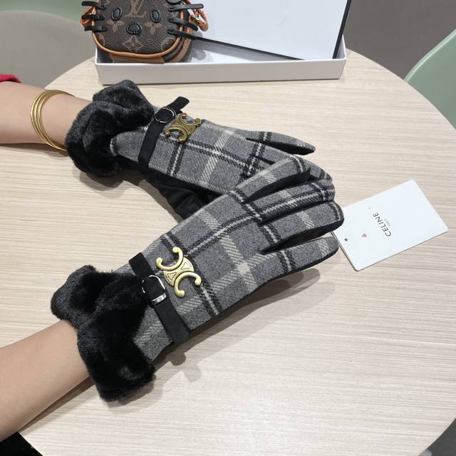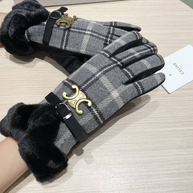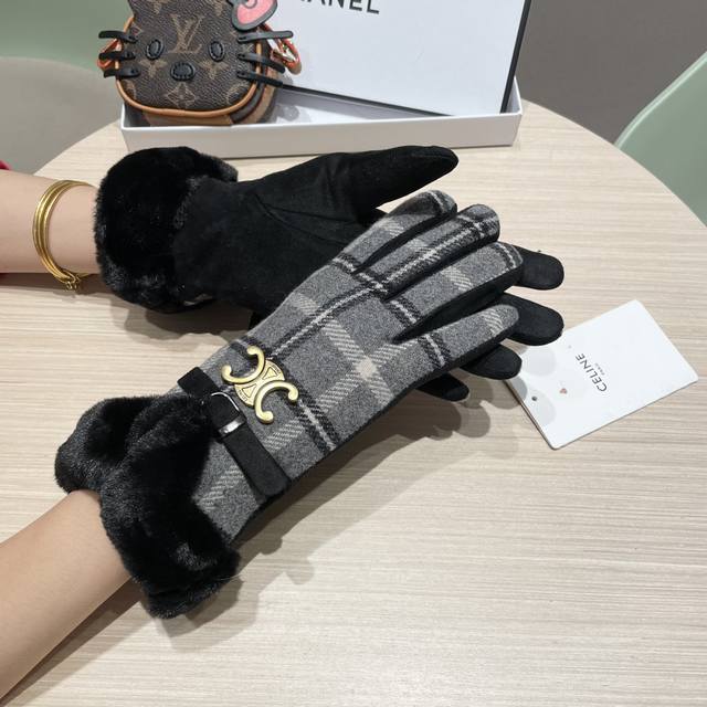 Celine Women's Winter Wool Gloves, Outdoor Cycling & Driving, Windproof, Cold-resistant, Warm, Fleece-lined, Thickened, Korean Style Plaid Winter Cotton