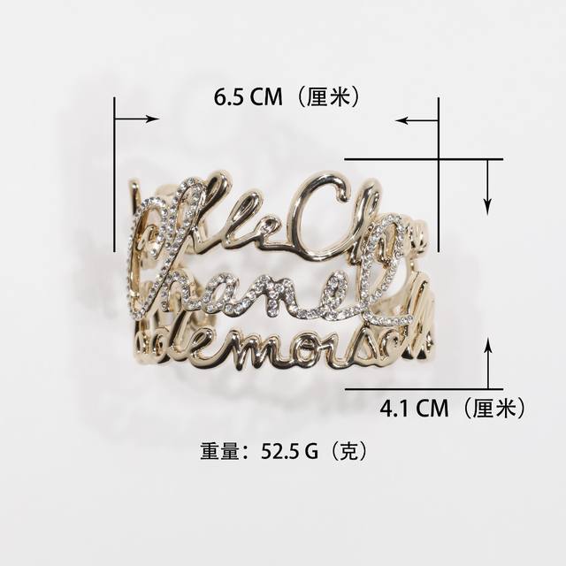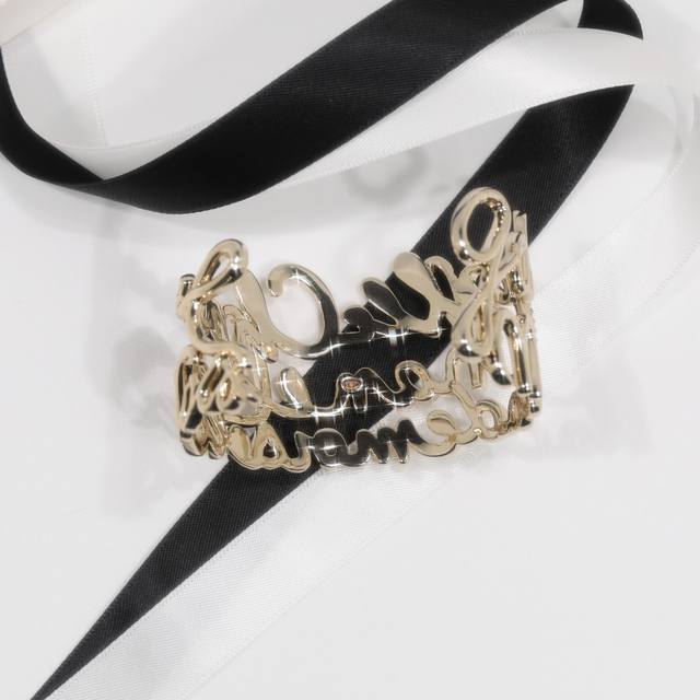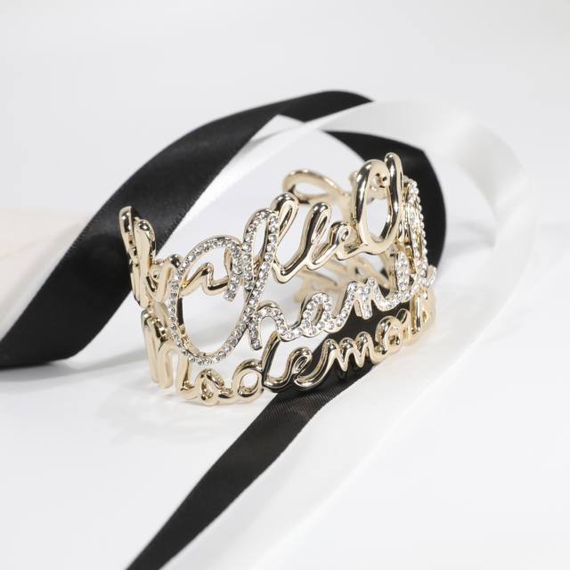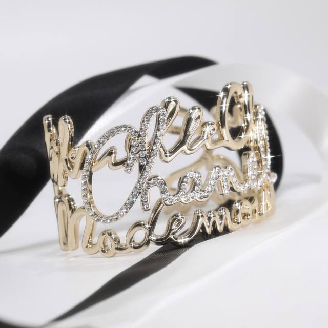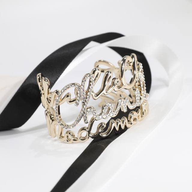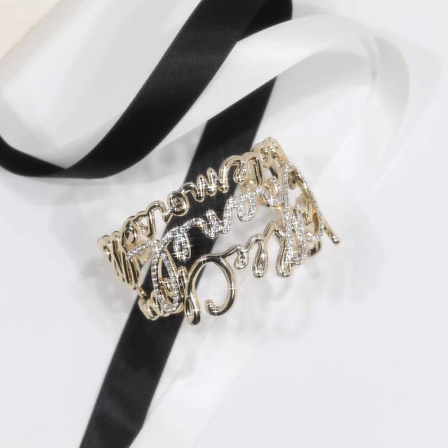 Ch Nel Bangle: A stylish and elegant gold-plated openwork rhinestone bangle featuring continuous cursive lettering. DDD