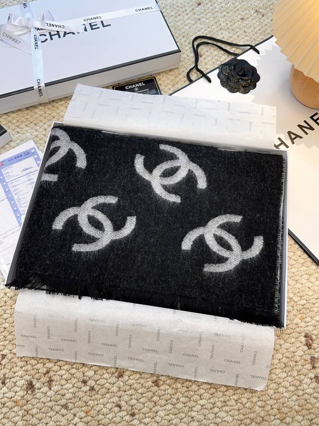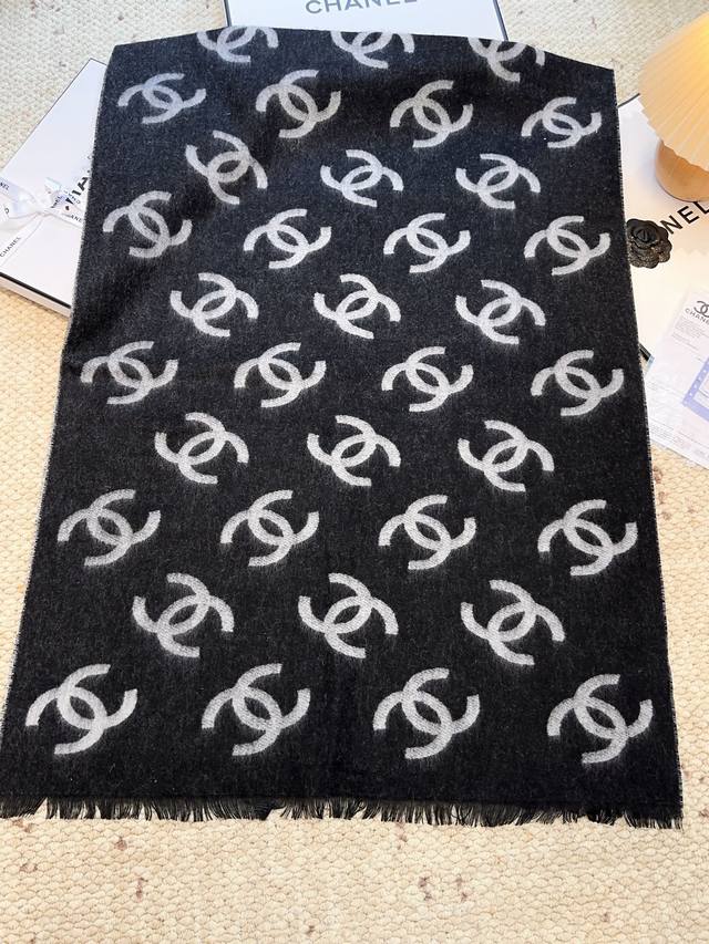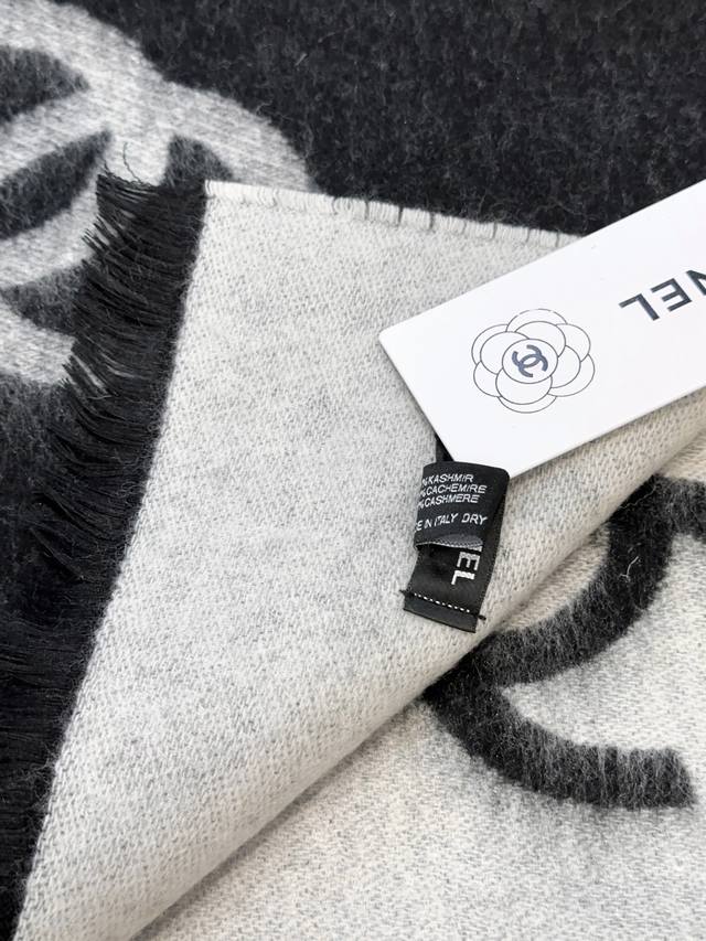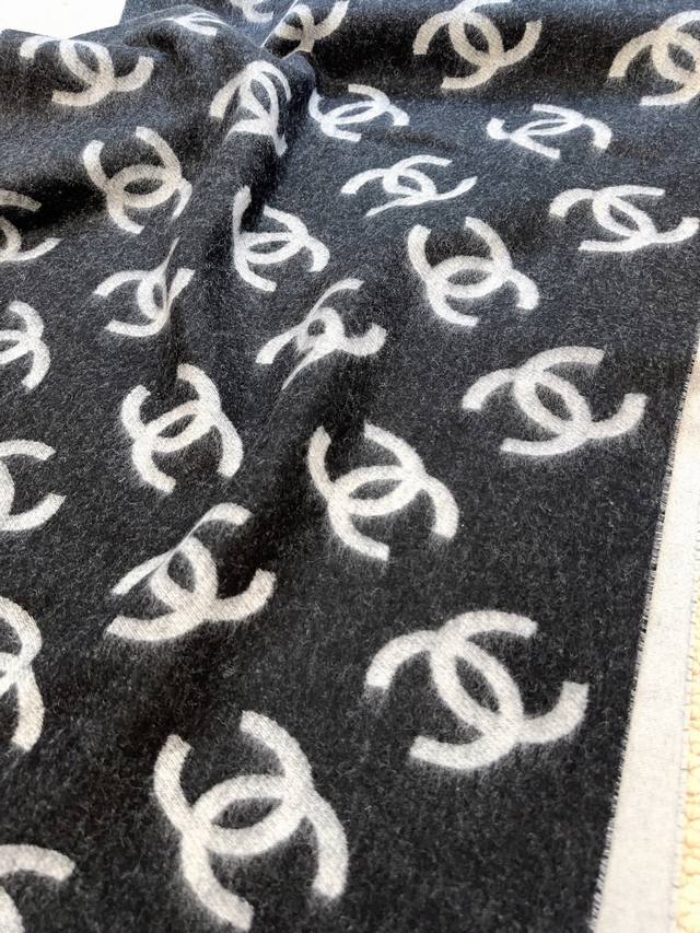 Chanel 25B New Double-Sided Cashmere Scarf/Shawl. Double-sided design, one side milk tea color, one side black, jacquard all-over print of the classic double C logo. Superb texture! Very high-quality, a large, warm, and practical piece. Directly from Europe, genuine authentic orders shipped with bulk orders. No need for fancy words, it's the best Chanel in the world. The cashmere is incredibly soft; you'll only know its beauty when you wear it. Absolutely high-end. Fake imitations can't replicate this. A foolproof way to present yourself, it will remain so for years to come. Its sophistication and elegance have been perfectly showcased by the designer, breathtakingly beautiful. A timeless, top-tier, high-fashion shawl, very substantial and with a beautiful drape. Incredibly stylish and comfortable to hold. Original price over 7000 RMB. 100% customer-supplied cashmere. Size: 70*200cm.