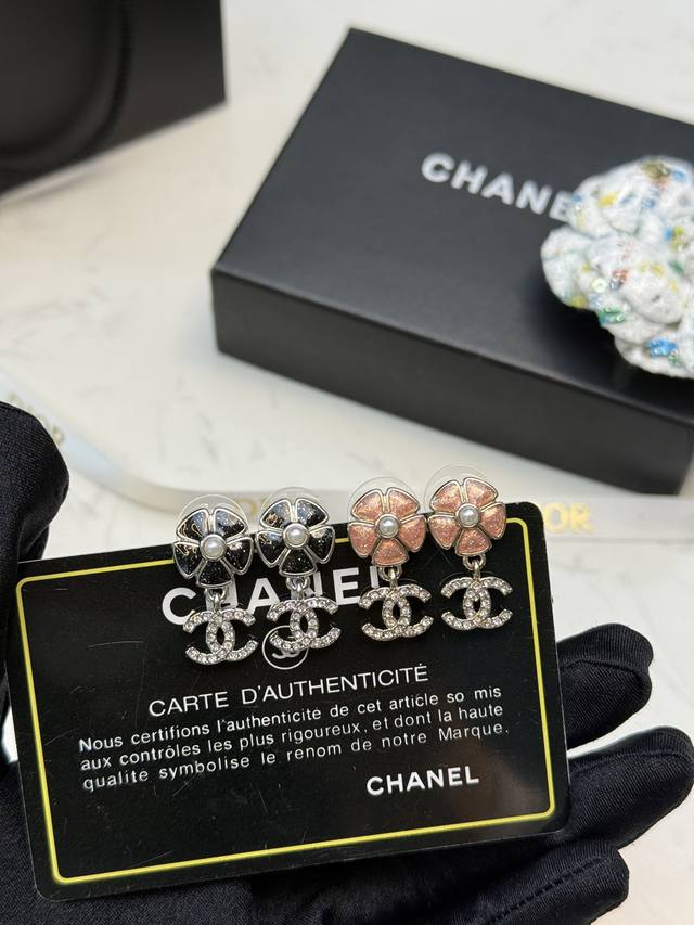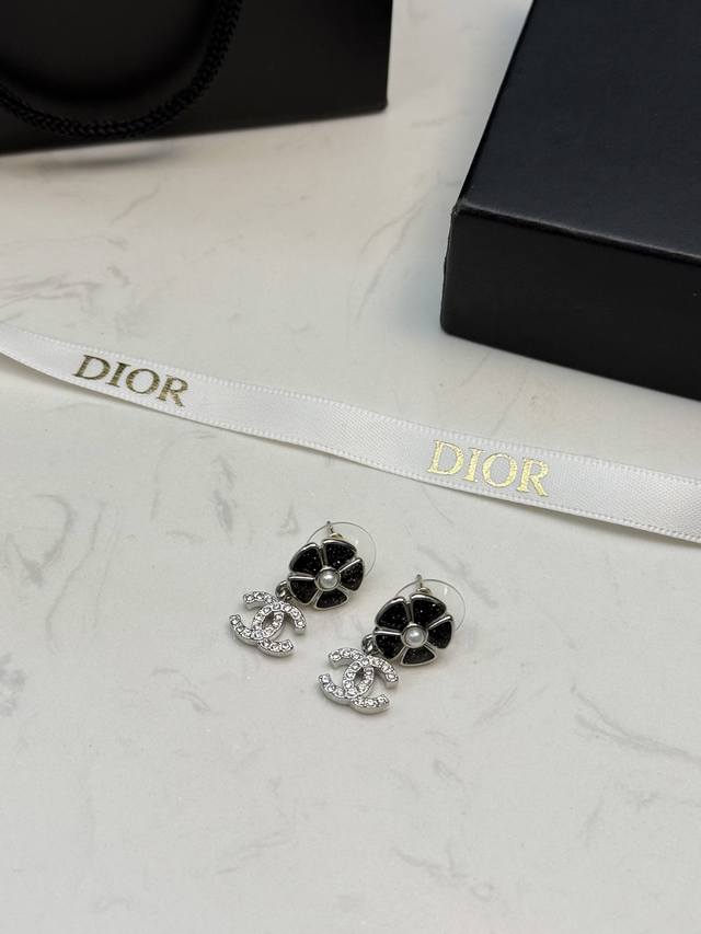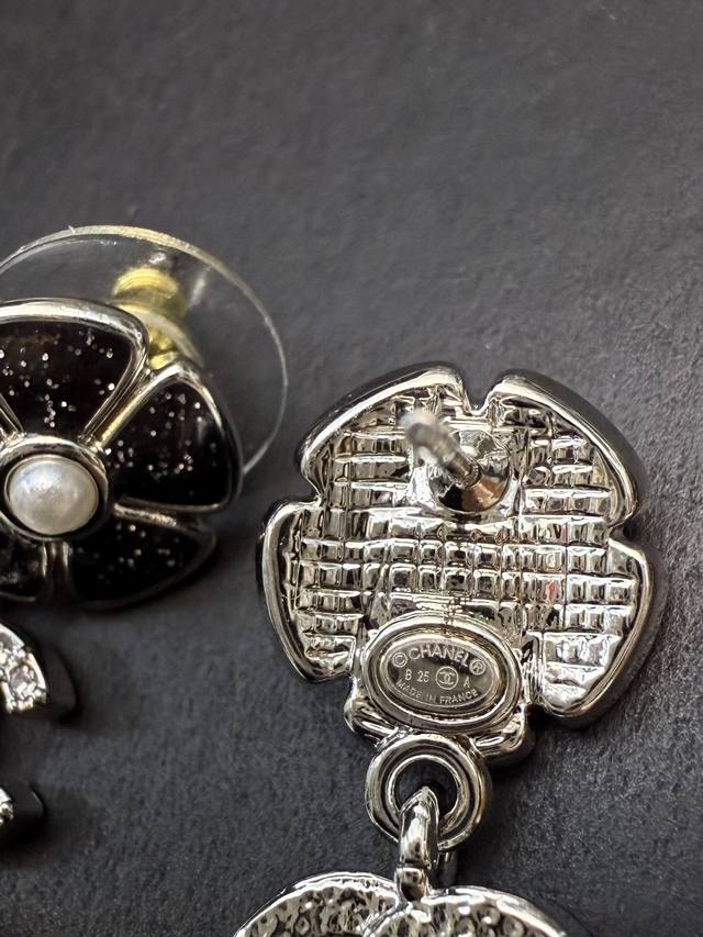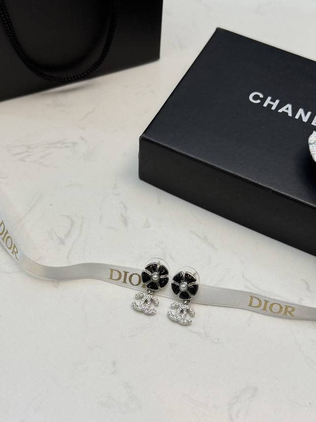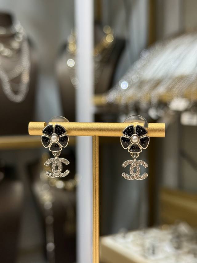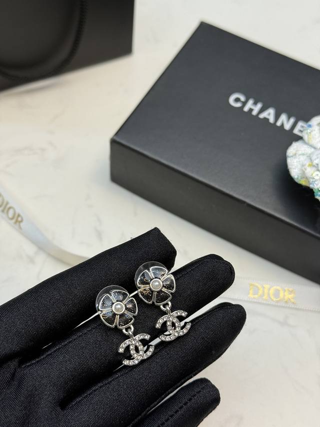 Chanel Black Camellia Earrings Ddd Chanel black camellia earrings, classic camellia design with black glitter petals, a central faux pearl embellishment, and an elegant and delicate double C logo encrusted with rhinestones. Highly recognizable brand, the metallic plating, faux pearl, and rhinestone materials exude understated luxury. Perfect for everyday or formal occasions, and a perfect complement to simple or classic outfits. DDD