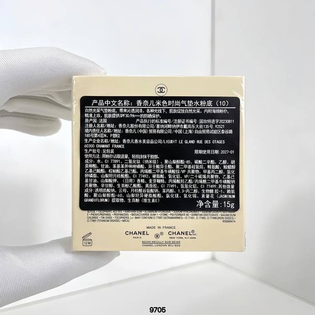 ). Code: 9705! Available with Chinese labels. 4 shades: Bd01#, B10#, B20#, Br12#. Includes 24 shades of Chanel beige fashion cushion foundation with date label.
