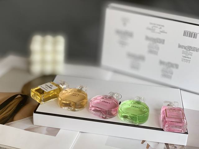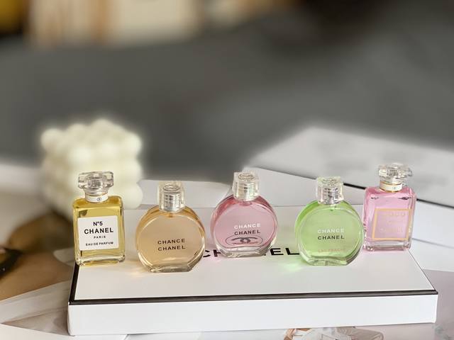 Chanel five-piece set in a cute white gift box, a five-piece perfume sample set in a medium gift box. See the picture to choose your favorite yellow, pink, and green Chance Encounter 7.5ml No. 5 Classic Passion Eau 7.5ml Modern Miss Coco 7.5ml