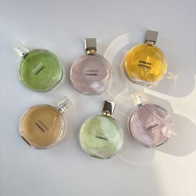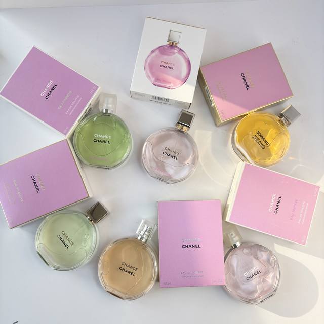 Original Quality Chanel Chance Collection 6 scents: Pink Chance Eau de Toilette, Green Chance Eau de Toilette, Yellow Chance Eau de Toilette. Real photos of the collection!