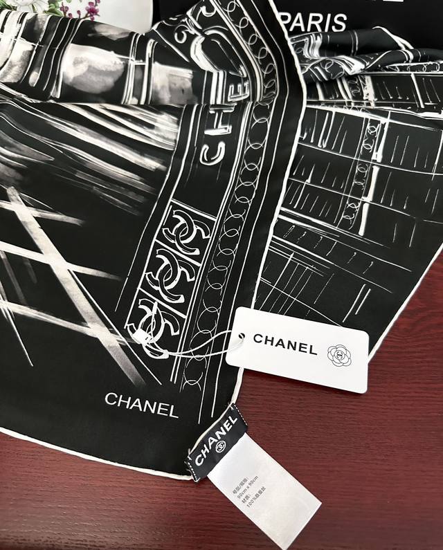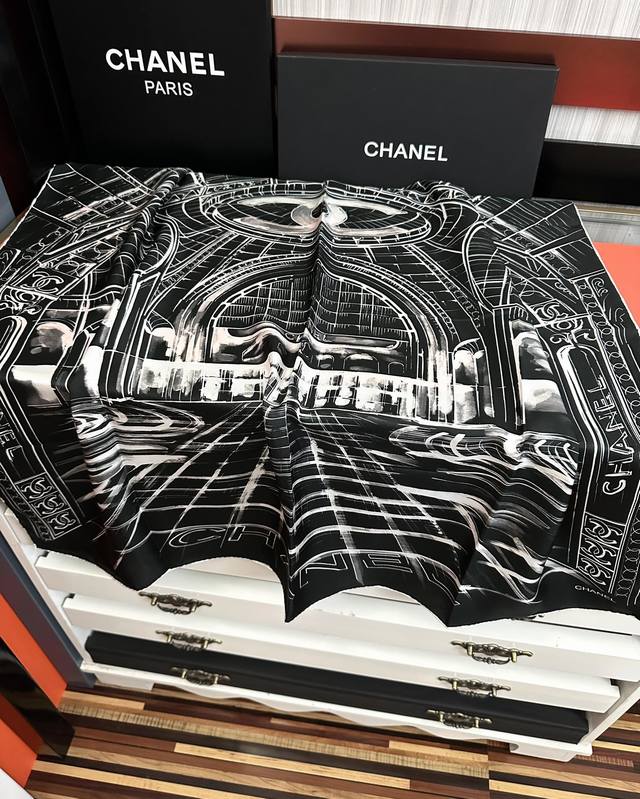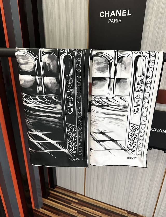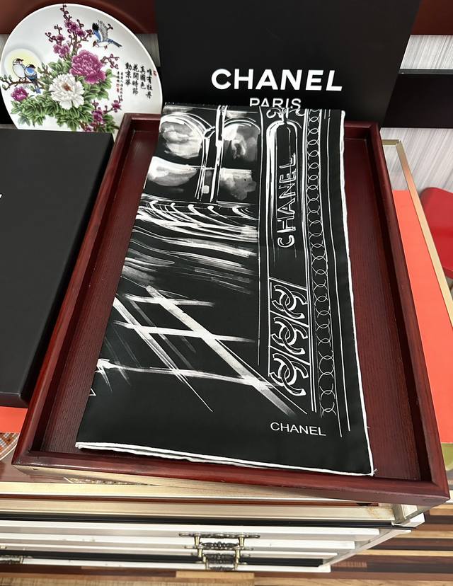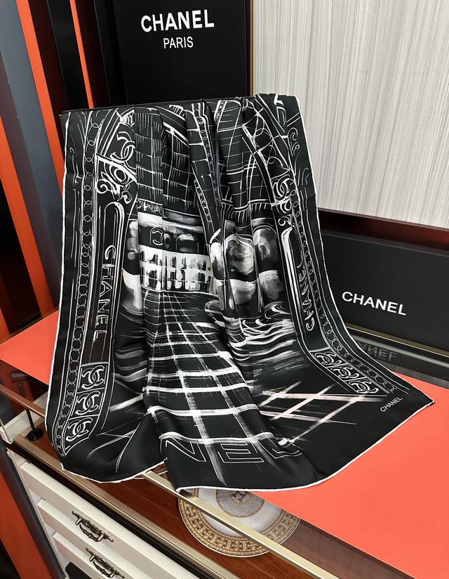 2610 New Chanel style, this year's hottest item, a must-have silk scarf. The pattern, synchronized with the official website, is from the entrance of the main hall of the Grand Palais in Paris named "Gabrielle Chanel." I fell in love with it at first sight. My first thought was to use it as a decorative silk scarf