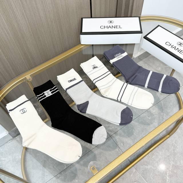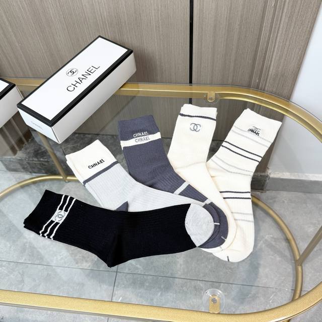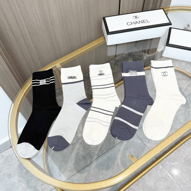 A box of five pairs of Chanel high-end versions ~ so beautiful that they are explosive. These Chanel cashmere socks are super soft and a must-have for trendy people. These Chanel counter-purchased quality mid-tube socks are super stylish and fashionable when paired together. Recommended! A must-have fashionable item!