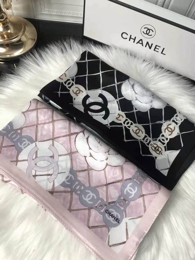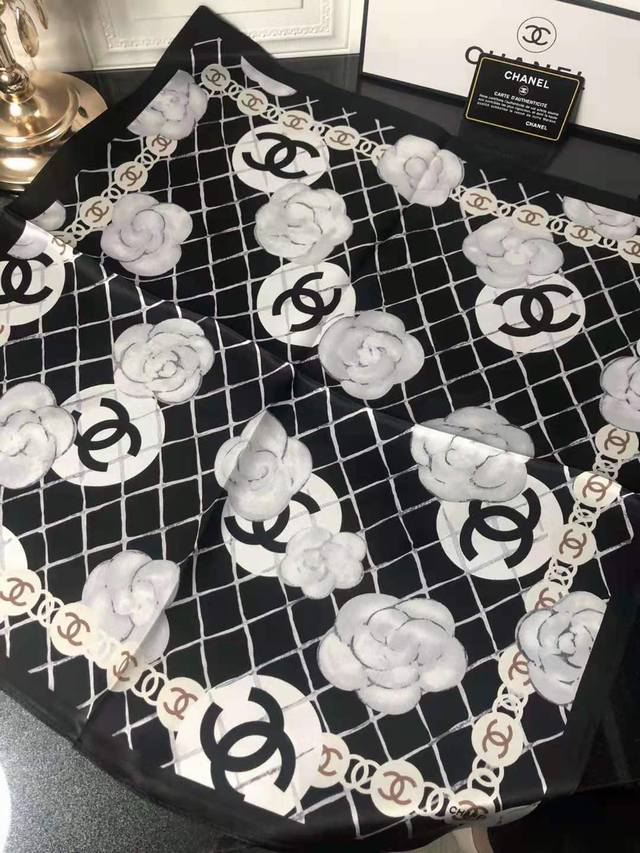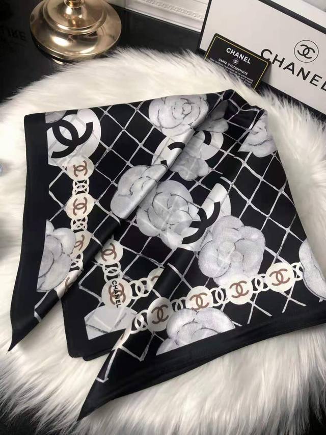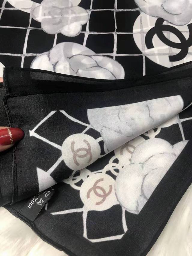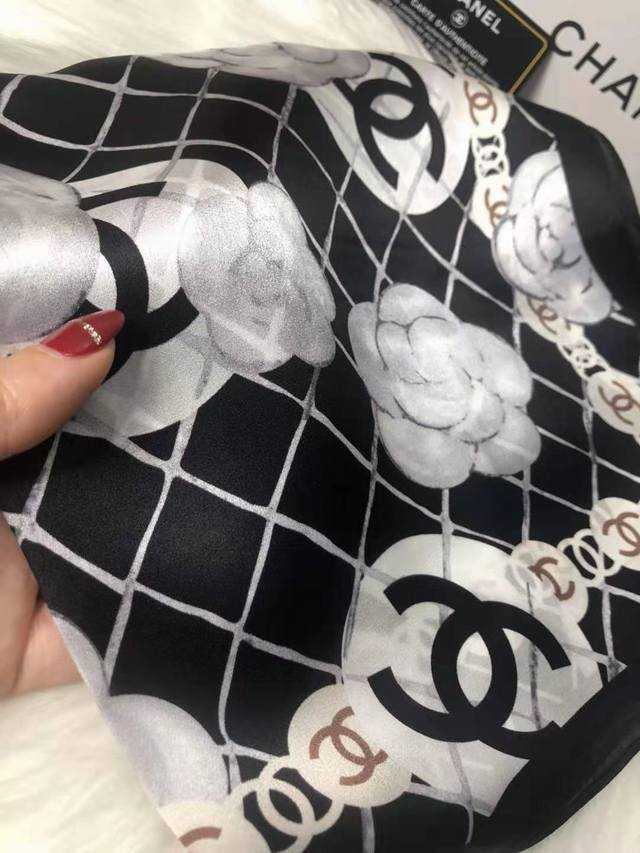 Chanel 100% mulberry silk crepe satin. A versatile small square scarf, youthful and elegant, can be used as a headscarf or as a must-have item with any outfit. Soft, comfortable, and skin-friendly. Size 50*50