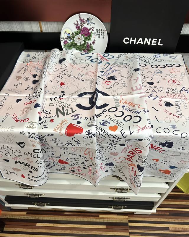 Chanel 18mm Reversible Same Color Romantic Love Scarf - Highly Recommended! A truly adorable design. A scarf featuring a pattern interwoven with Coco Chanel's favorite items and the brand's logo, cleverly combining love within a charming design. [Smile] Globally limited edition, definitely not a scarf you can buy with money. Size: 90x90 mm. Material: 100% silk. 3 colors available.