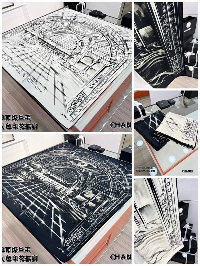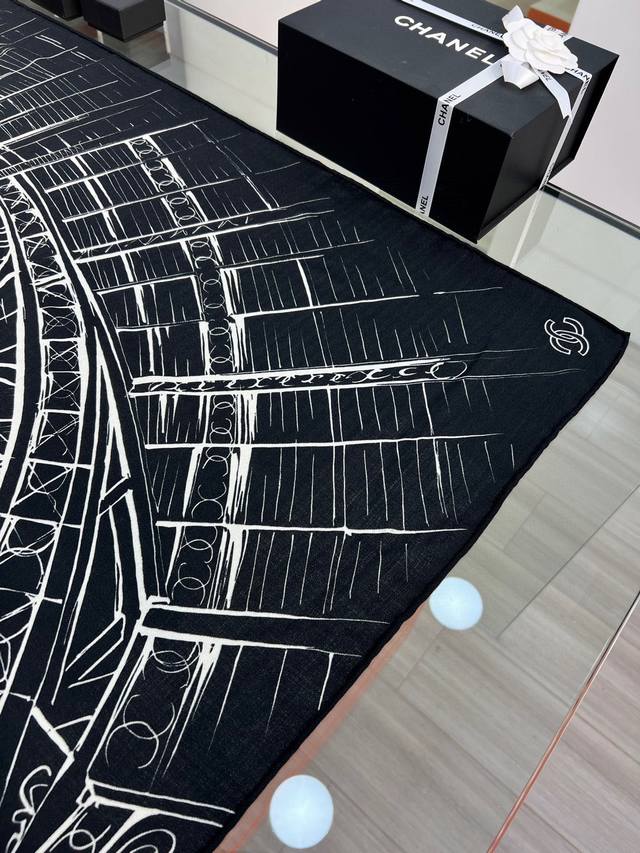 . This shawl features a pattern inspired by the entrance to the main hall of the Grand Palais in Paris, dedicated to Gabrielle Chanel. I instantly fell in love with this piece, and my first thought was to use it as a scarf decoration. It's so beautiful! It also looks great on the body, and it's so soft and skin-friendly that you can frame it when you get tired of it.