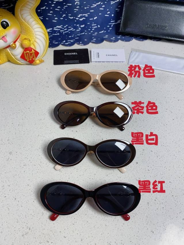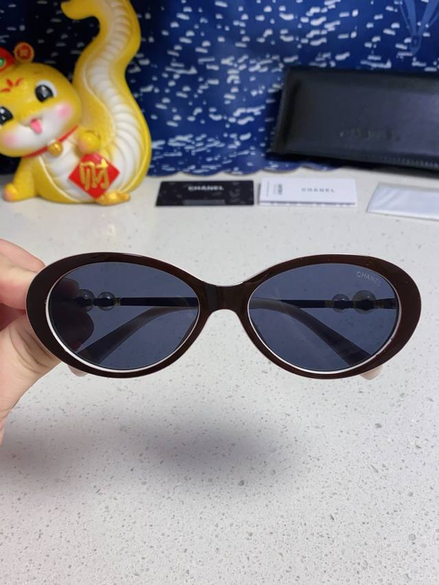 Chanel 2025 New Double Pearl Sunglasses Women's Retro High-End Black Oval Sungla