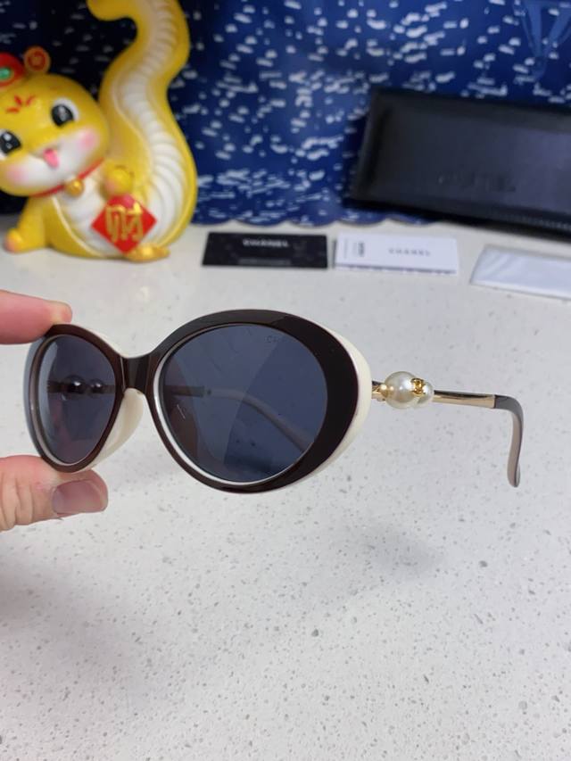 / Chanel 2025 New Double Pearl Sunglasses Women's Retro High-End Black Oval Sungla