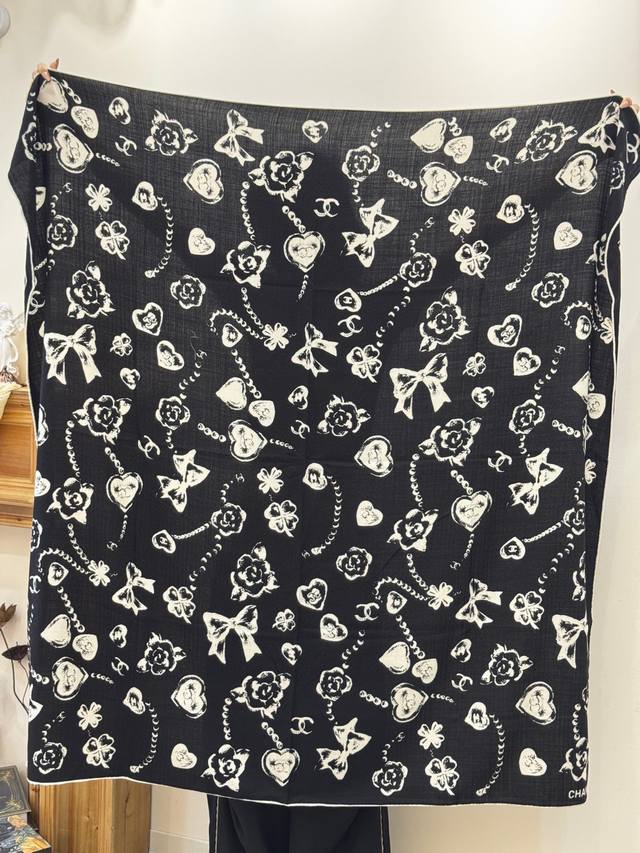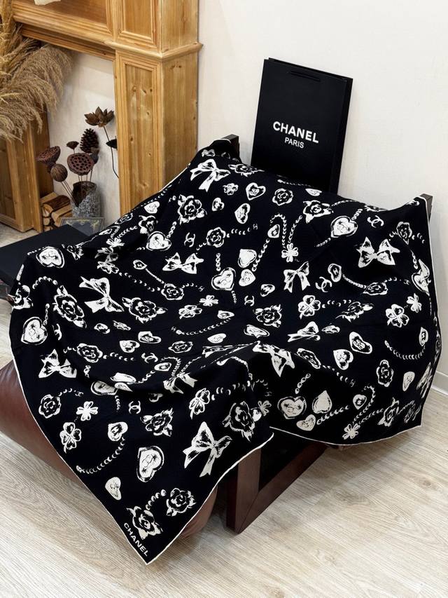 Chanel ~25 Fall/Winter New Arrival~ Heart-shaped Pearl Four-leaf Clover 140 Double-sided Velvet Shawl Hand-rolled hem velvet square scarf 30% Mulberry Silk 70% Cashmere This classic piece embodies the essence of powerful and captivating femininity. This 140 square scarf is innovatively designed to interpret boundless emotion and freedom, writing a unique narrative of individuality. Size: 135*135 cm. Due to the hand-rolled hem, the indicated size may vary slightly.