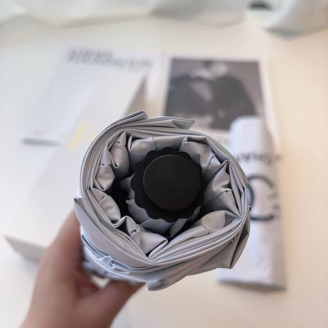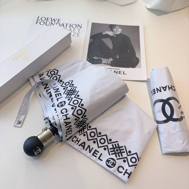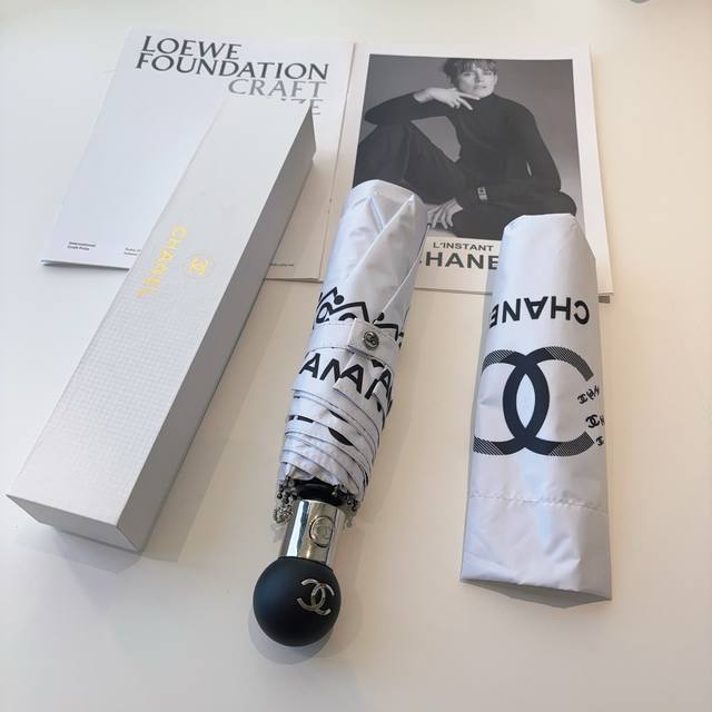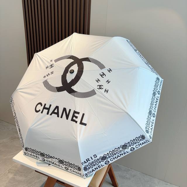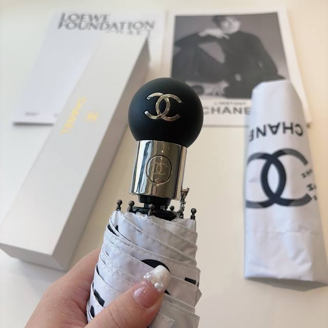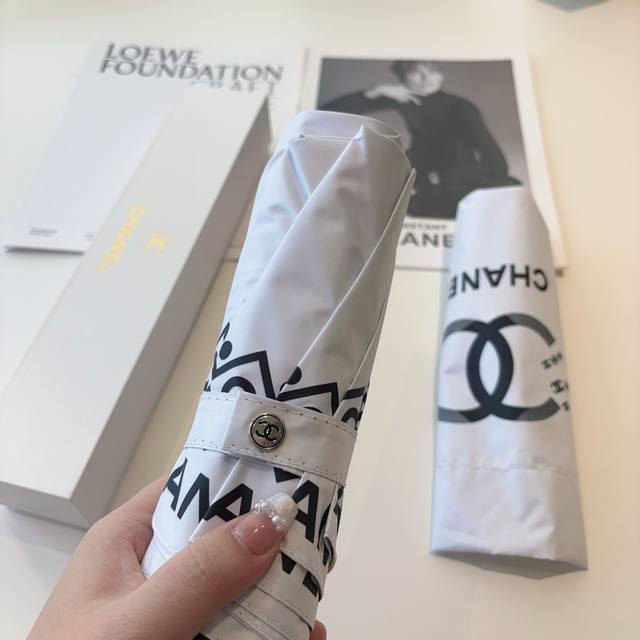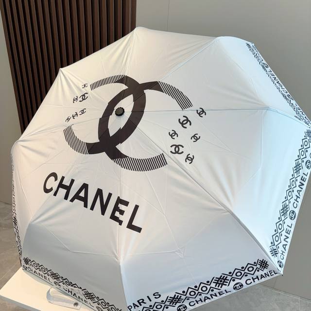 Chanel 3-fold automatic folding umbrella. The design, incorporating the iconic Chanel logo, exudes elegance and luxury. Carrying it creates a unique visual effect. Move with the umbrella's spirit! Under the scorching sun, it features exclusive sun protection technology! The canopy is made of ultra-high density pongee fabric, lightweight and water-repellent, making it fearless in wind and rain.