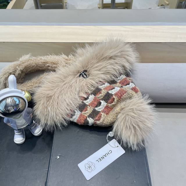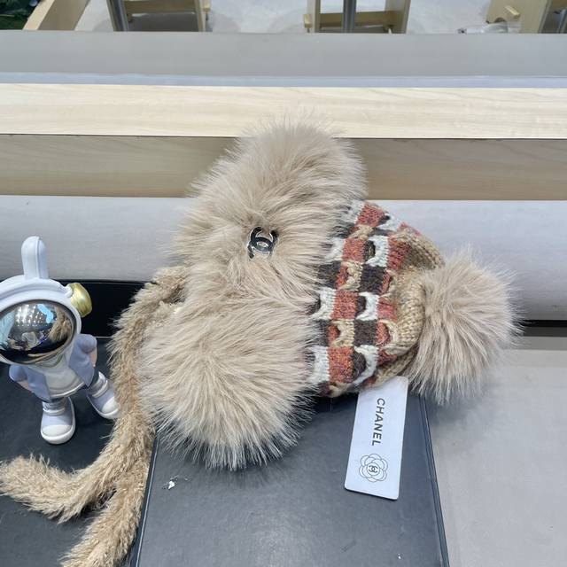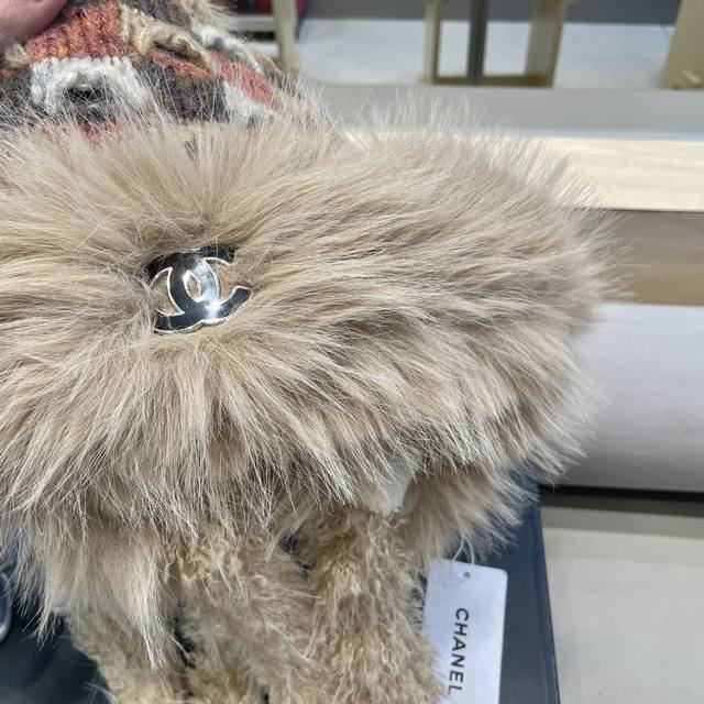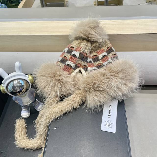 / Chanel braided wool hat warm jacquard square color matching large fur brim pullo