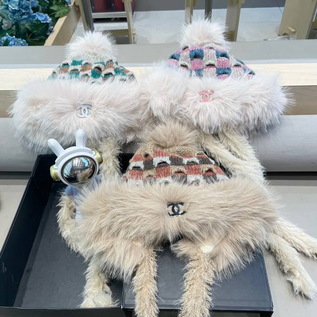 Chanel braided wool hat warm jacquard square color matching large fur brim pullo