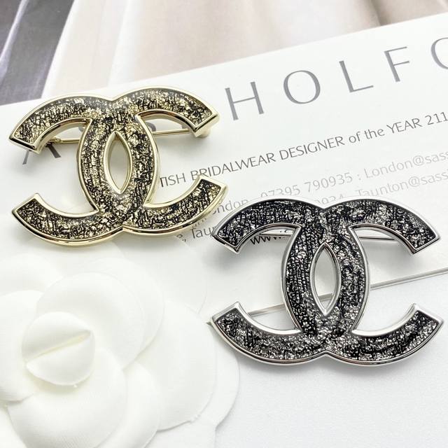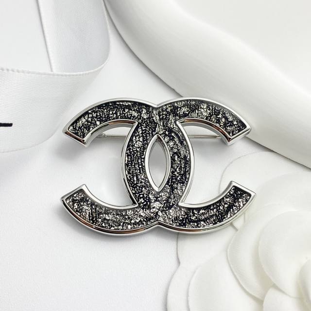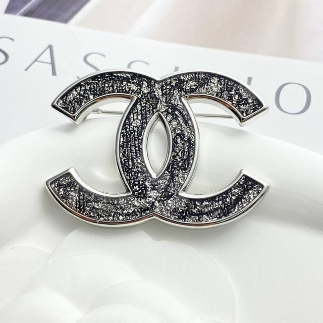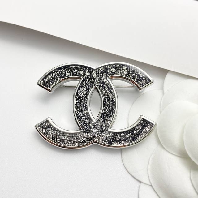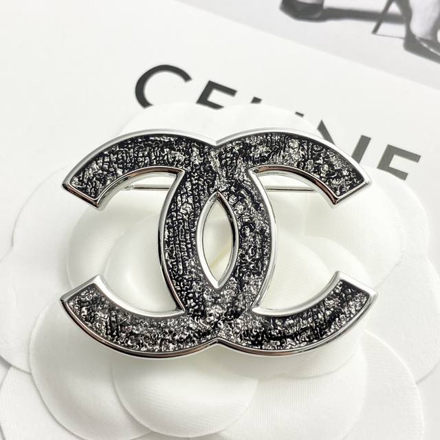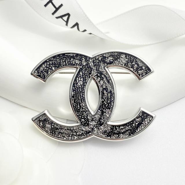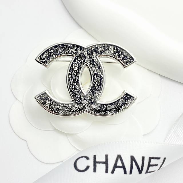The double C design features a lace base with fine shimmer, infused with silver glitter, encased in a silver metal casing