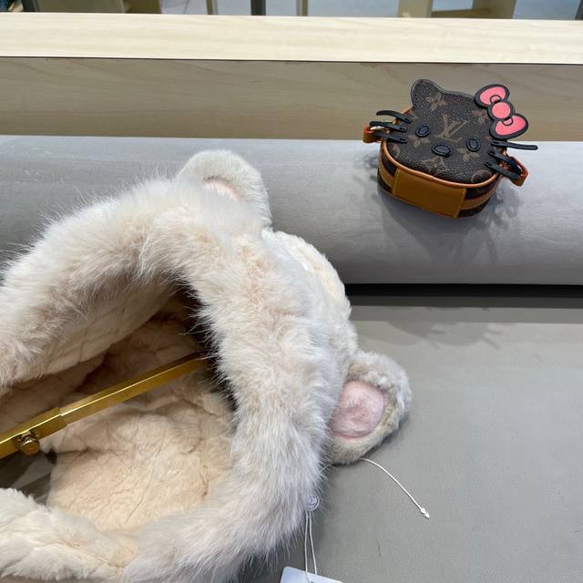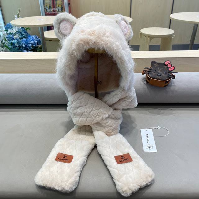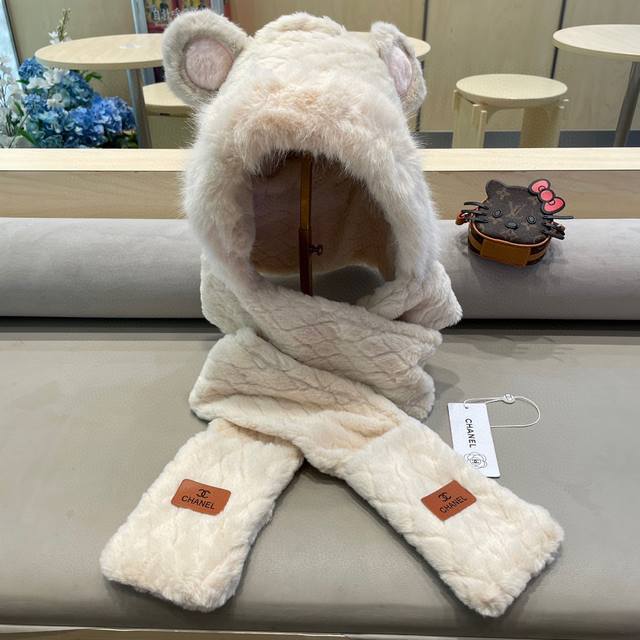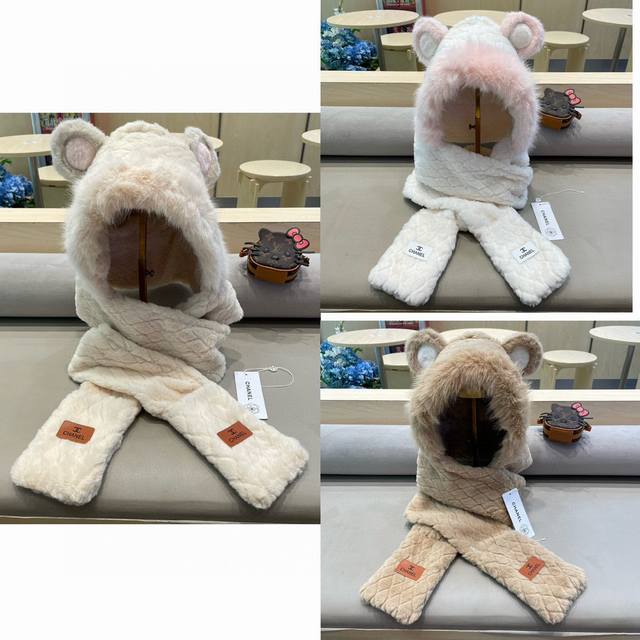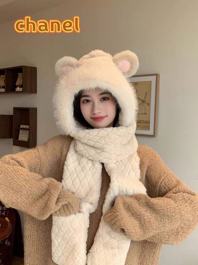 Chanel Chanel bear hat autumn and winter women's scarf gloves integrated hooded winter neck scarf cute warm plush winter three-piece set