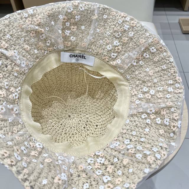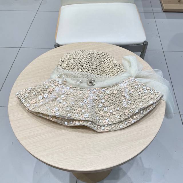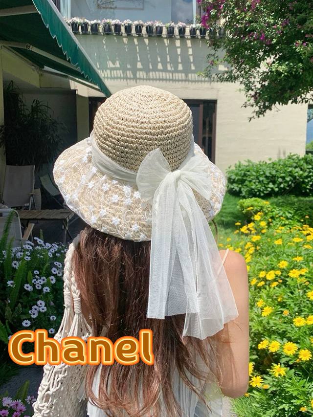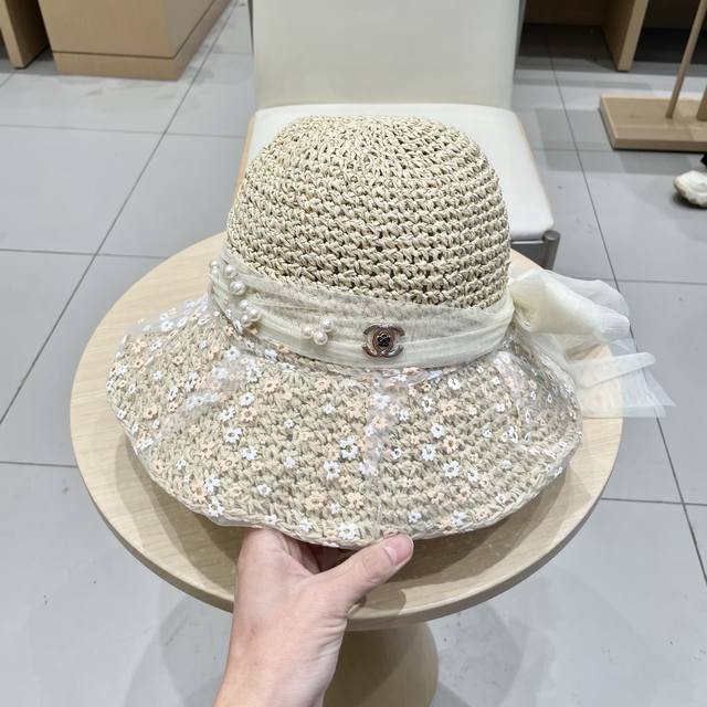 Chanel Chanel Pearl Lace Flower Fisherman Hat Women Spring and Summer Bow Beach Holiday Straw Hat Straw Sun Hat