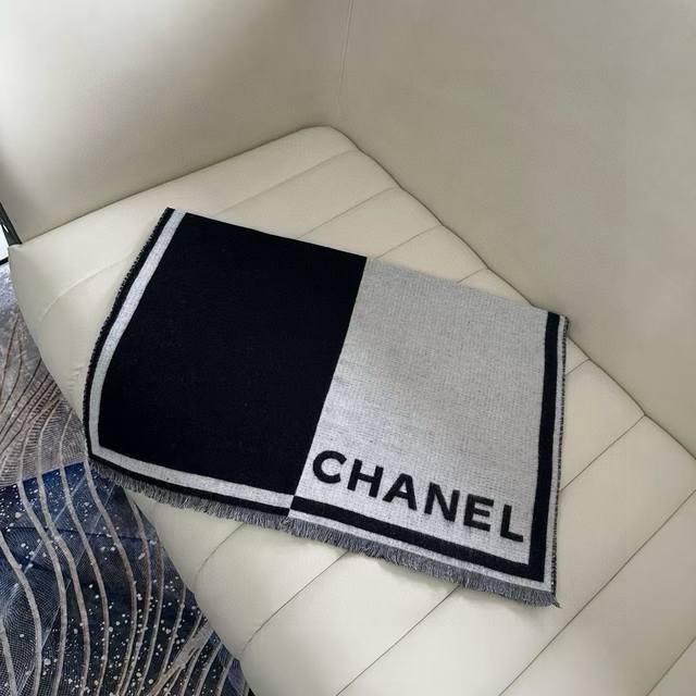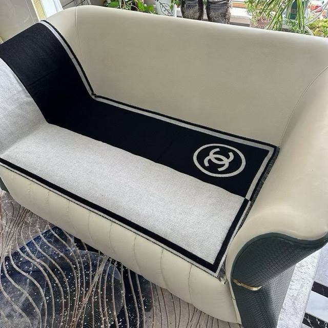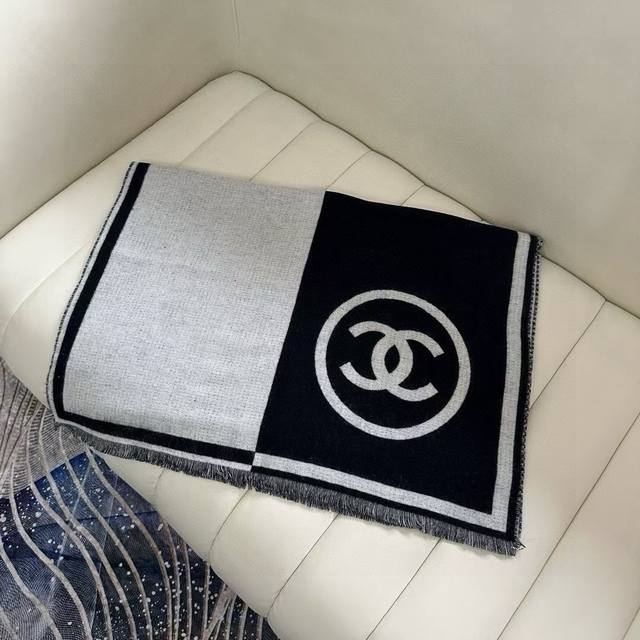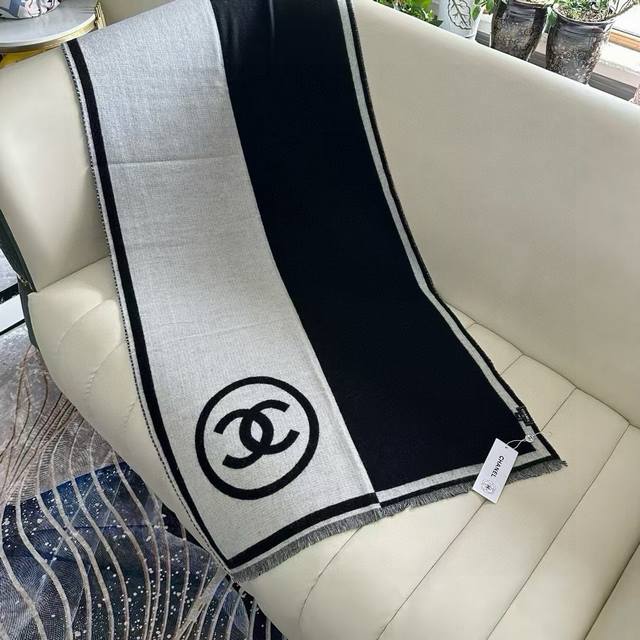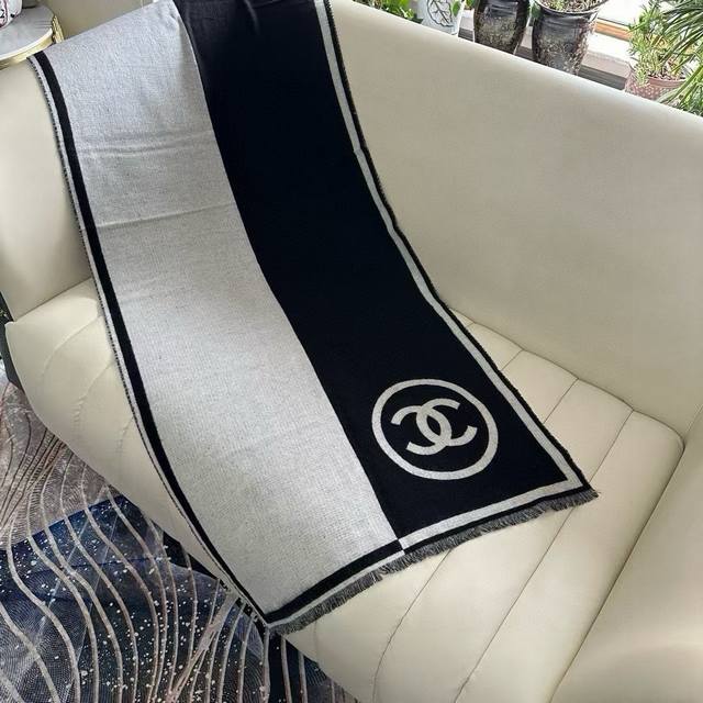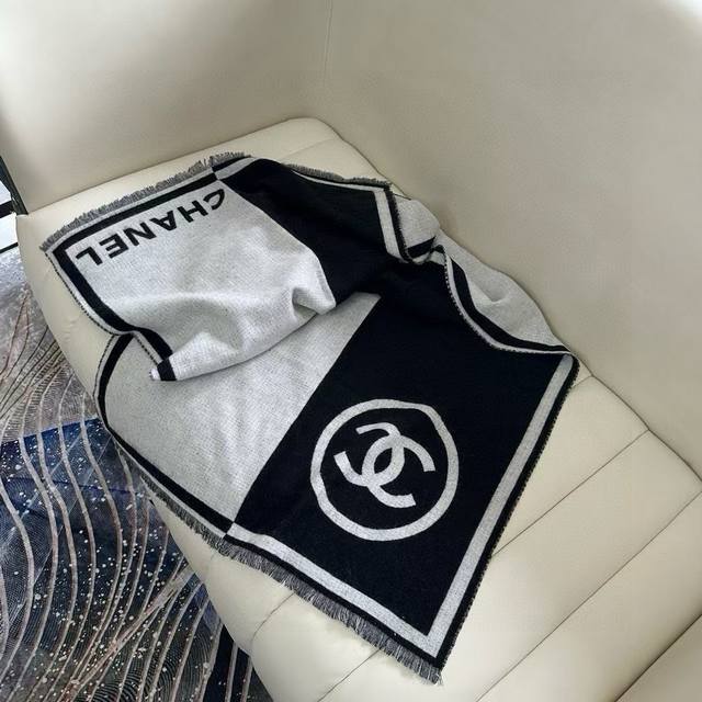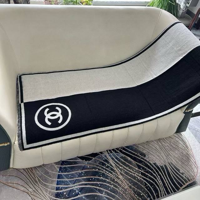 Chanel classic black and white symmetrical double-sided shawl. Super classic black and white color matching, simple and durable style. 98% cashmere 2% wool, soft and warm to the touch. Wrapping it in winter will make you feel safe. Large size 195*65Cm, can be used as a scarf or a portable blanket.