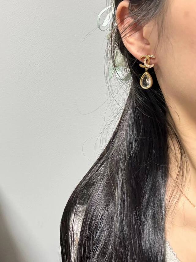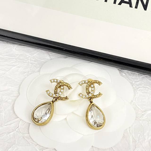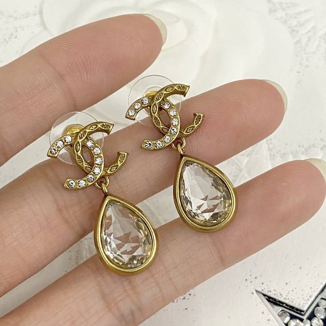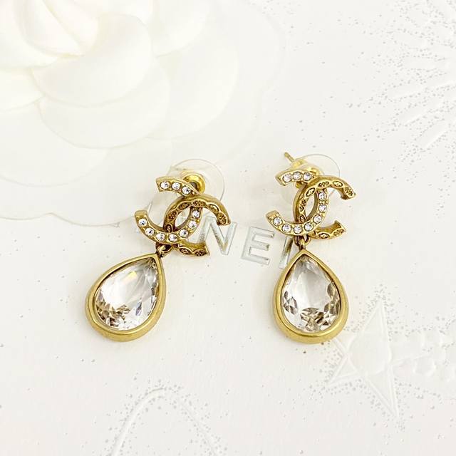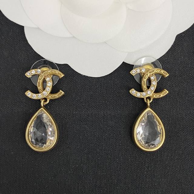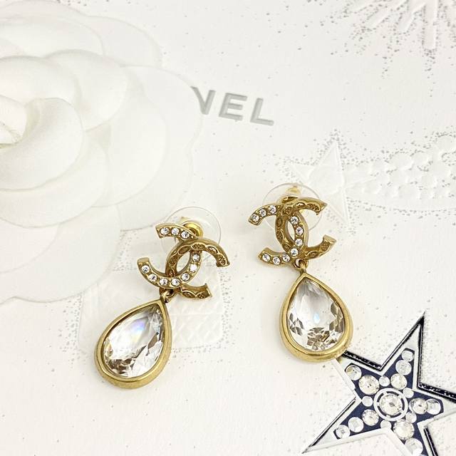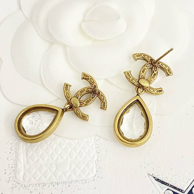 Chanel earrings are hot sellers! New arrival! Chan 24 distressed vintage gold double C pendant earrings! Totem-carved, half-diamond double C design with a zircon teardrop shape