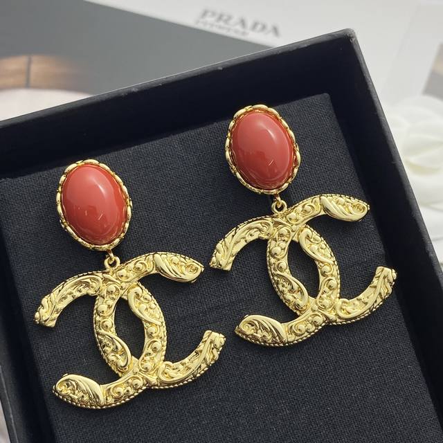 Chanel earrings are hot sellers! New arrival! Chan 24 Vintage Lava Cameo Double C Red Gemstone Earrings! The large metal lava double C has a vintage feel! Paired with red gemstones, they create a retro and elegant look, giving you a truly high-end retro vibe. The earrings are a perfect match for a cool queen look. A touch of red in winter, perfect with a black coat for fall and winter!