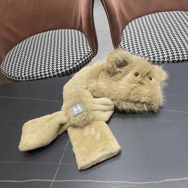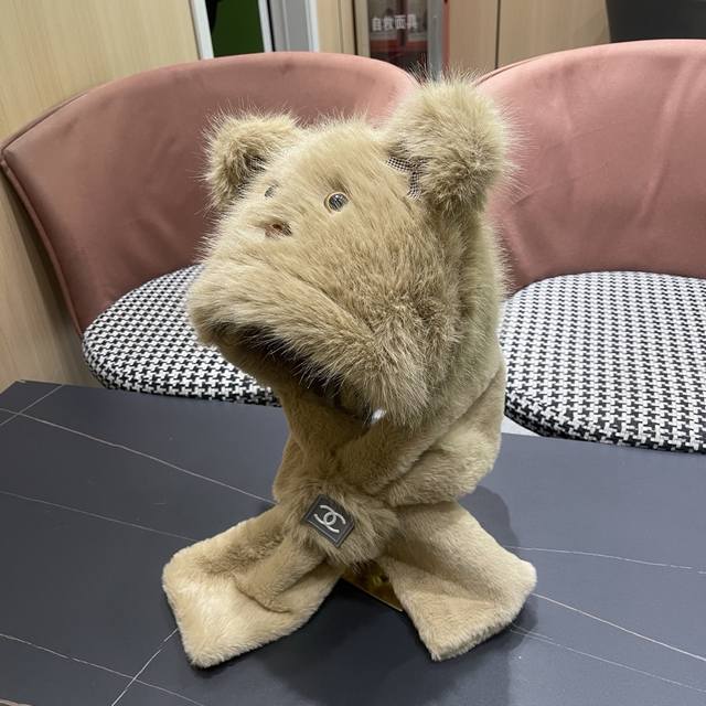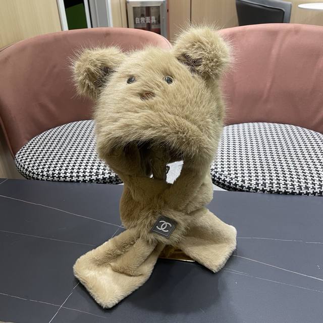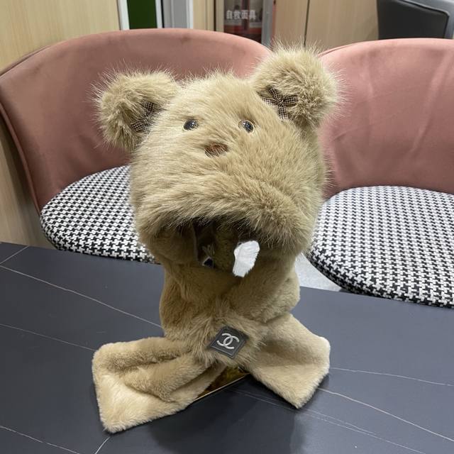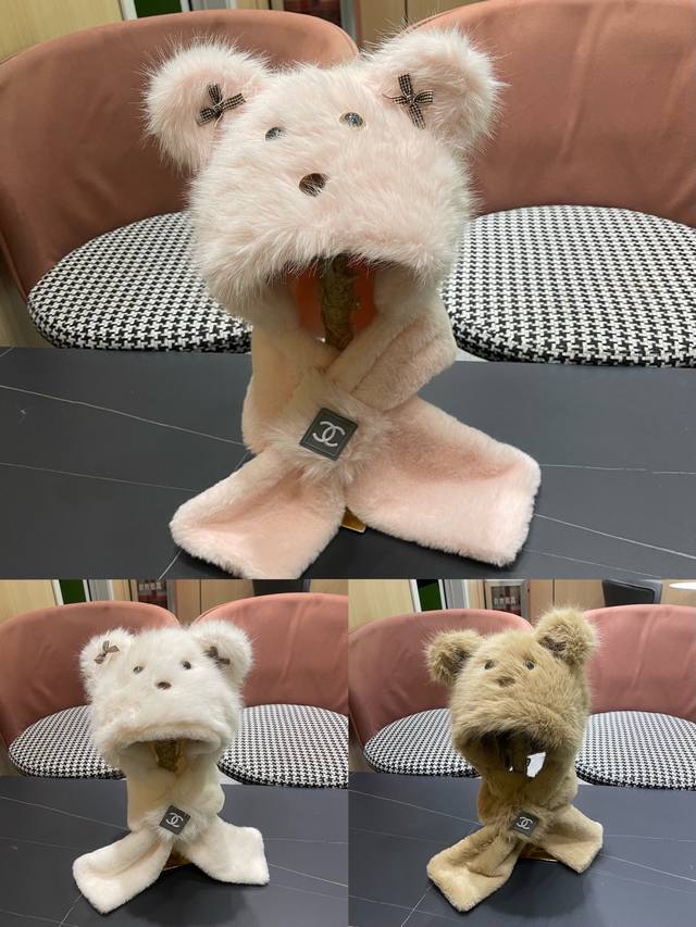 / Chanel fluffy cute bear ear bow plush hat and scarf two-piece set, thick and war