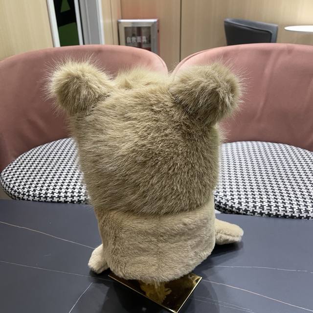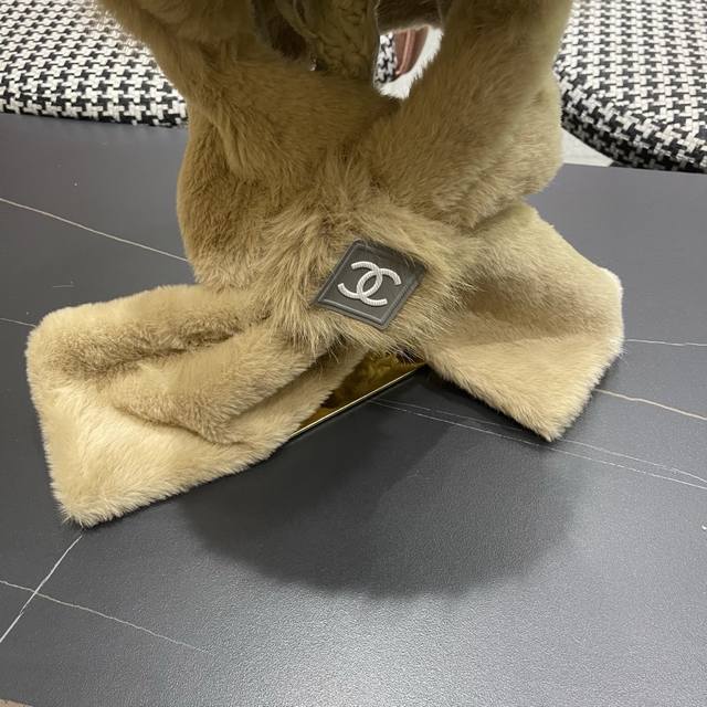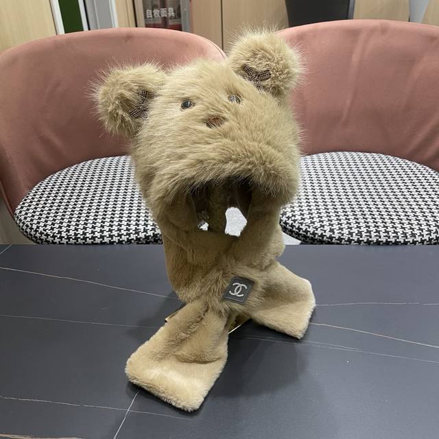 Chanel fluffy cute bear ear bow plush hat and scarf two-piece set, thick and warm Lei Feng hat DDD